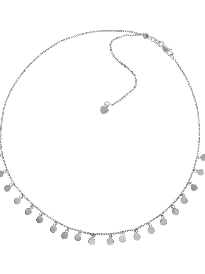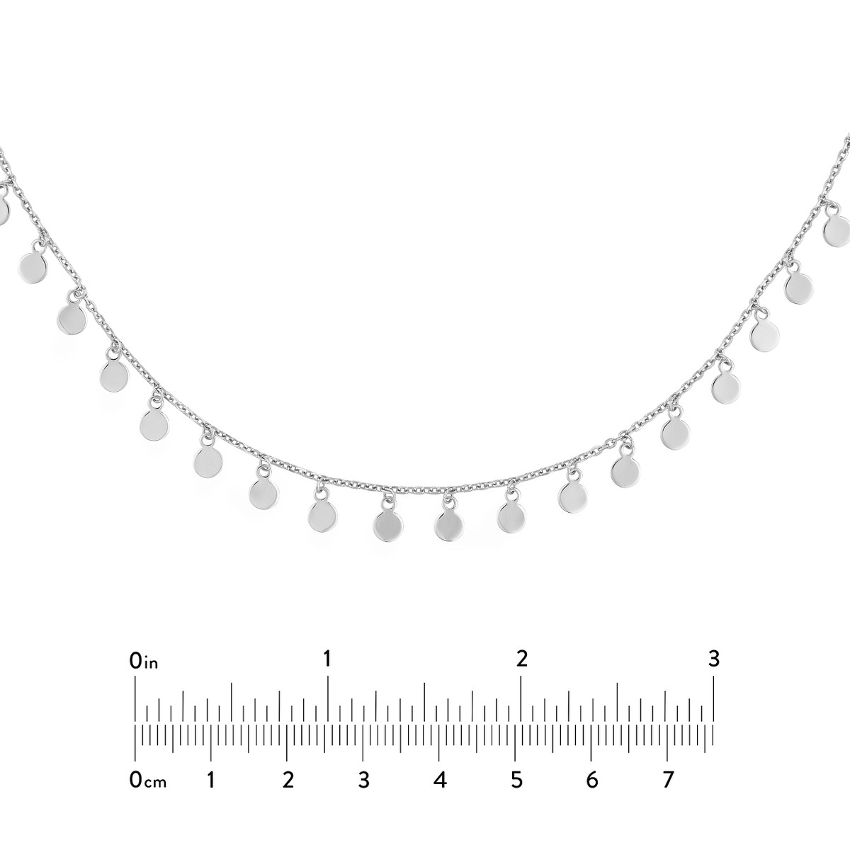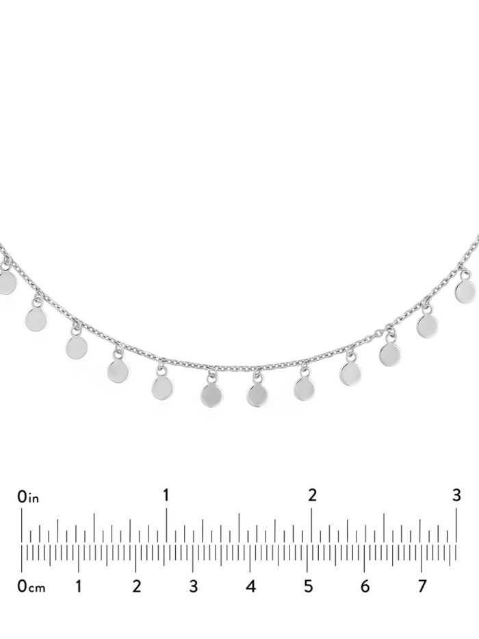 Express your unique style with this charming Sterling Silver Small Disc Dangles Adjustable Choker. Crafted in rhodium-plated Sterling Silver, this choker features dainty disc dangles that add a touch of modern sophistication. The adjustable slider bead allows you to personalize the length, creating a look that’s uniquely you.