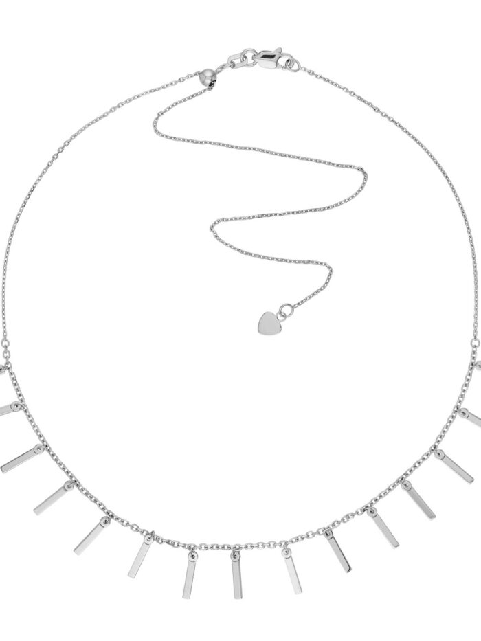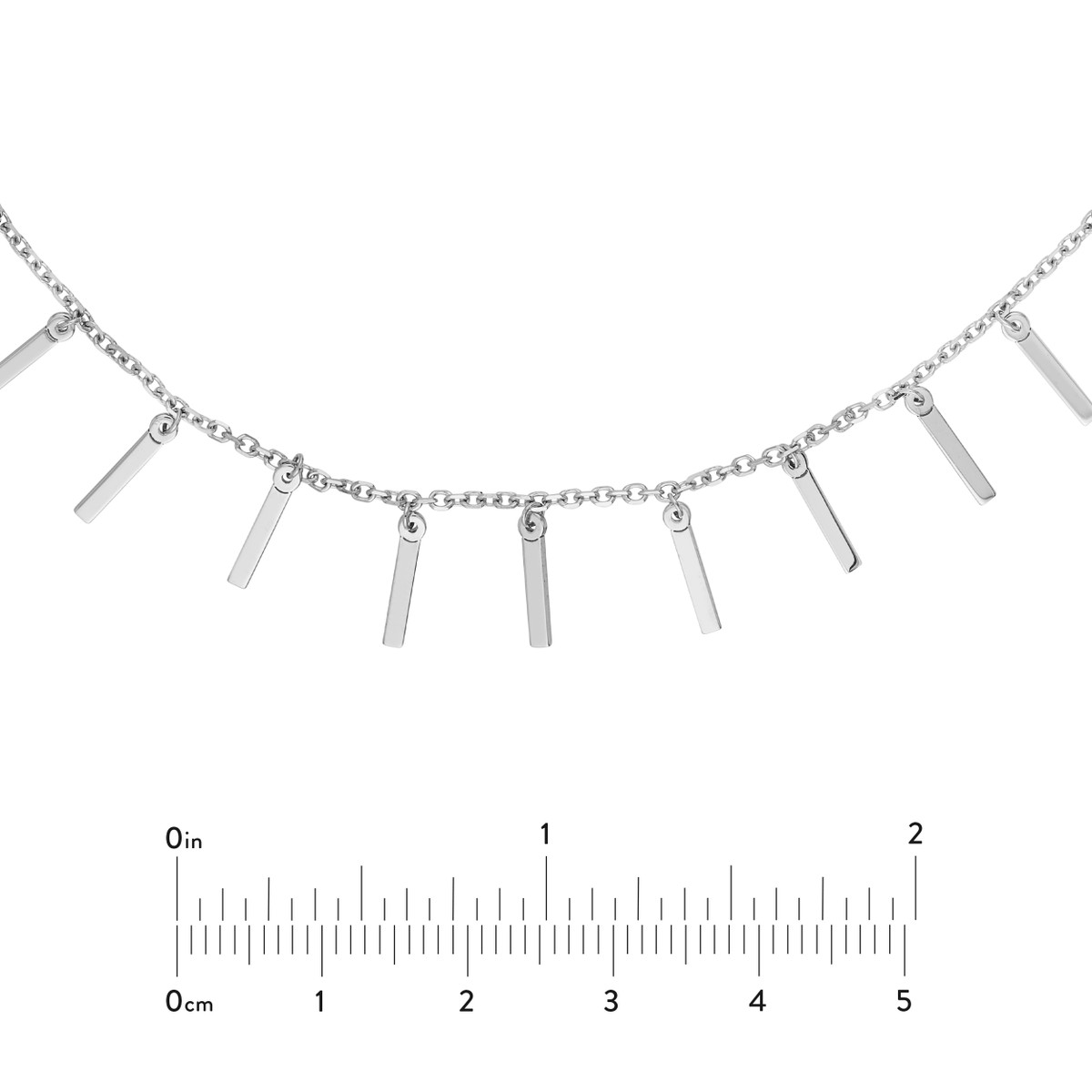 Effortlessly elevate your style with this captivating Sterling Silver Staple Bar Dangles Adjustable Choker. Crafted from rhodium-plated Sterling Silver, this choker features trendy staple bar dangles that add a touch of modern sophistication. The adjustable slider bead allows you to customize the length, ensuring a perfect fit for every occasion.