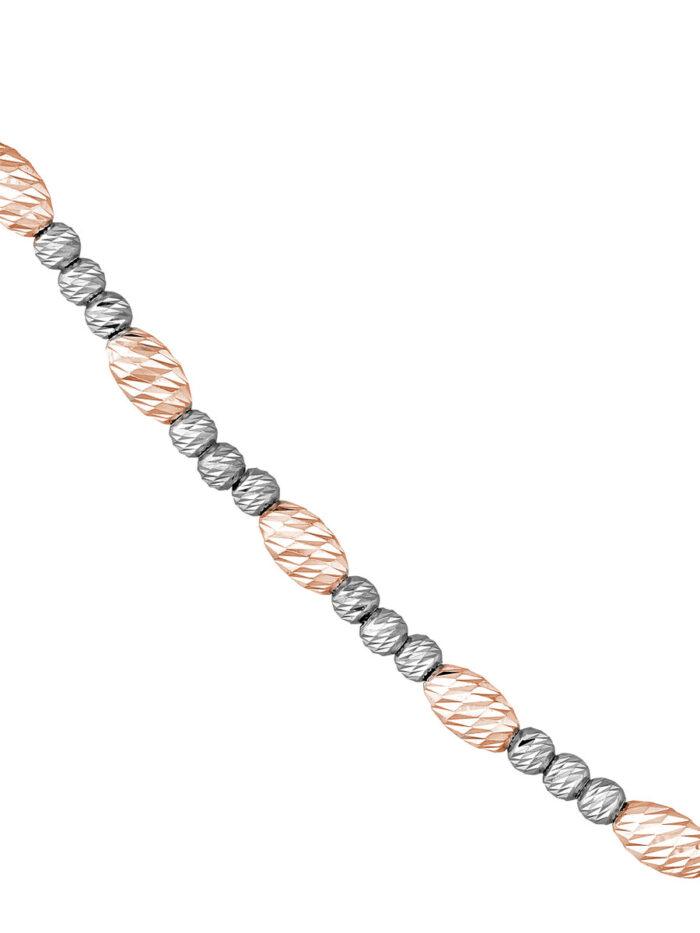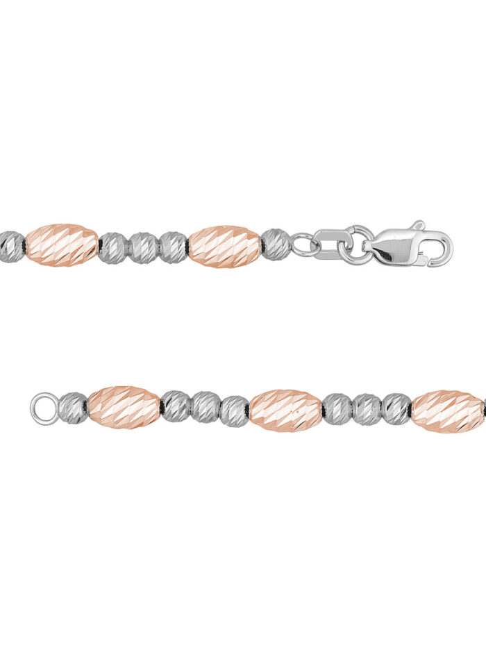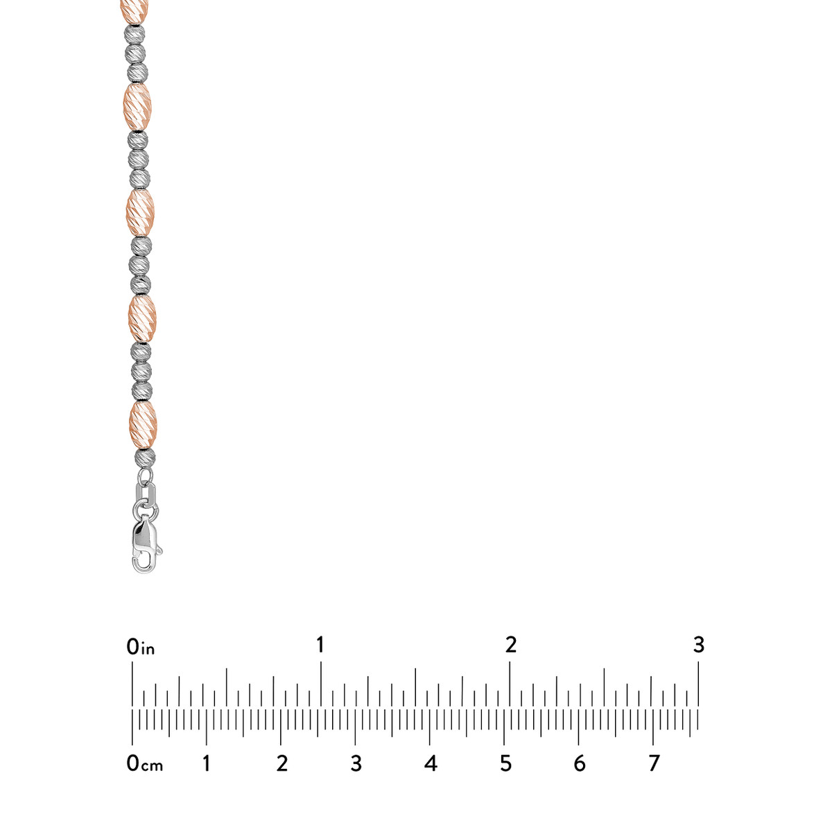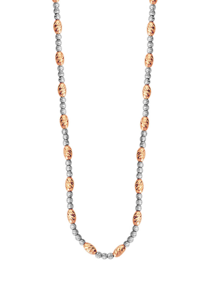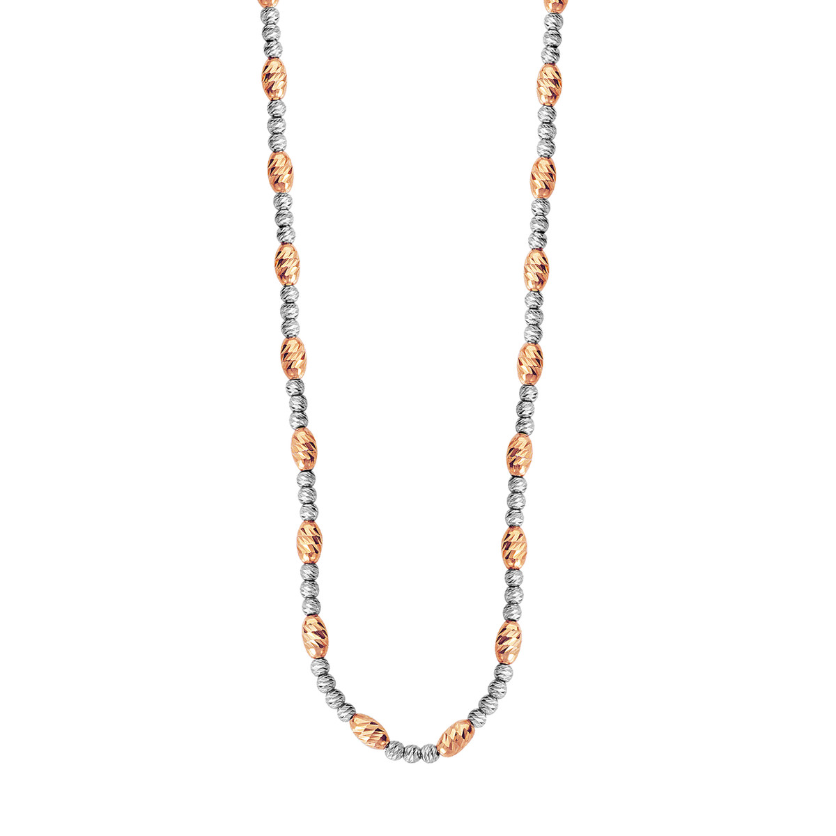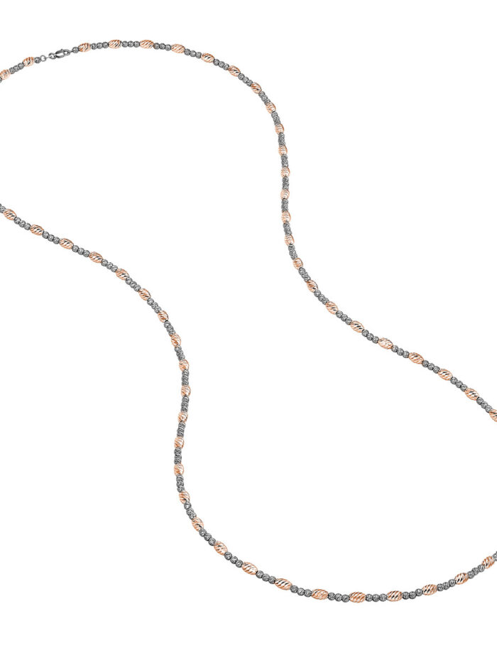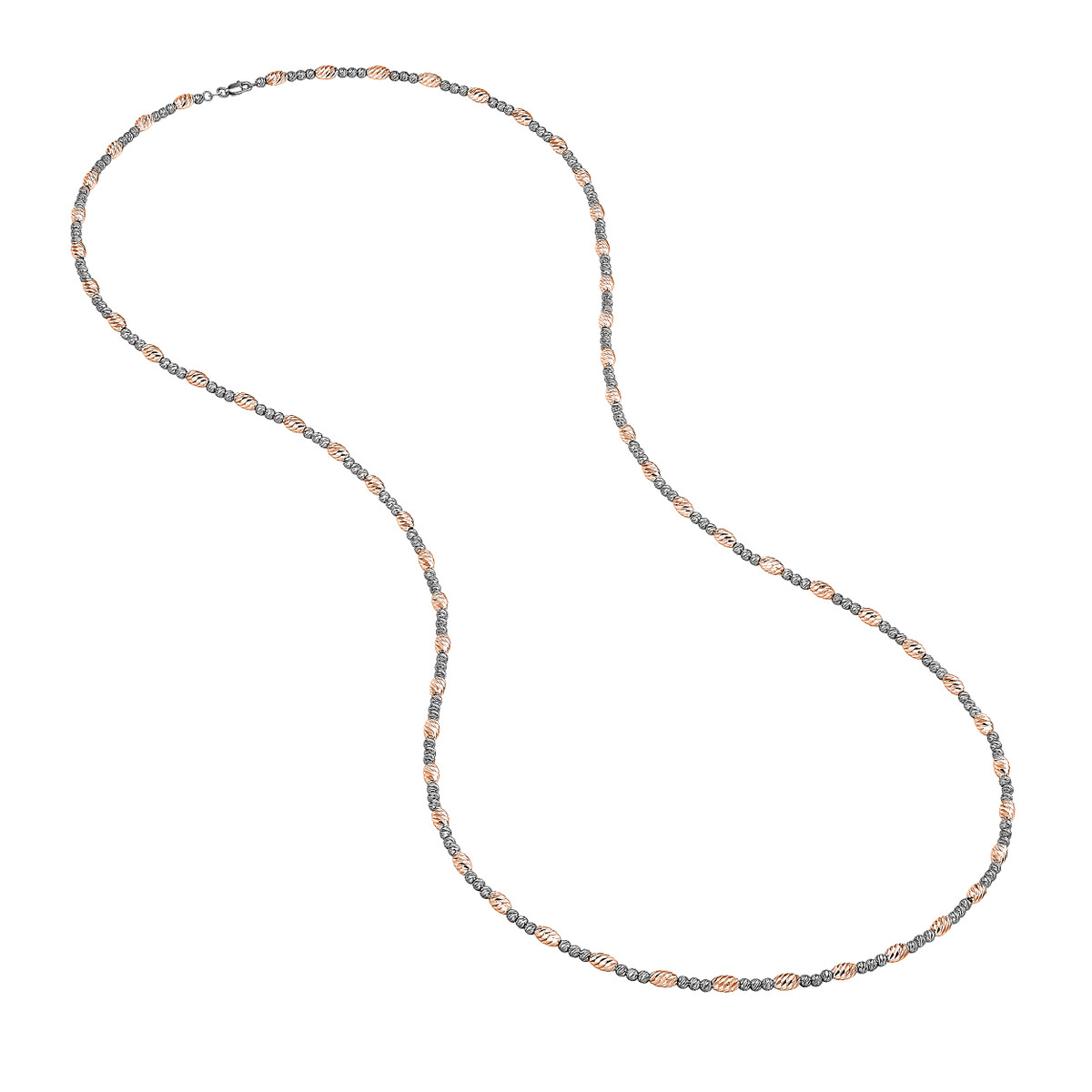 Embrace a blend of modern and classic with this stunning sterling silver necklace. Featuring a unique combination of white and rose gold finishes, this 36-inch-long necklace is adorned with beautiful diamond-cut beads strung on a delicate cable chain. This versatile piece adds a touch of sophisticated elegance to any outfit, making it perfect for both everyday wear and special occasions.