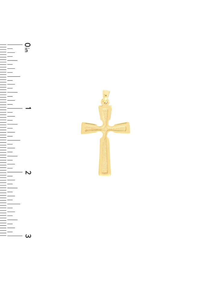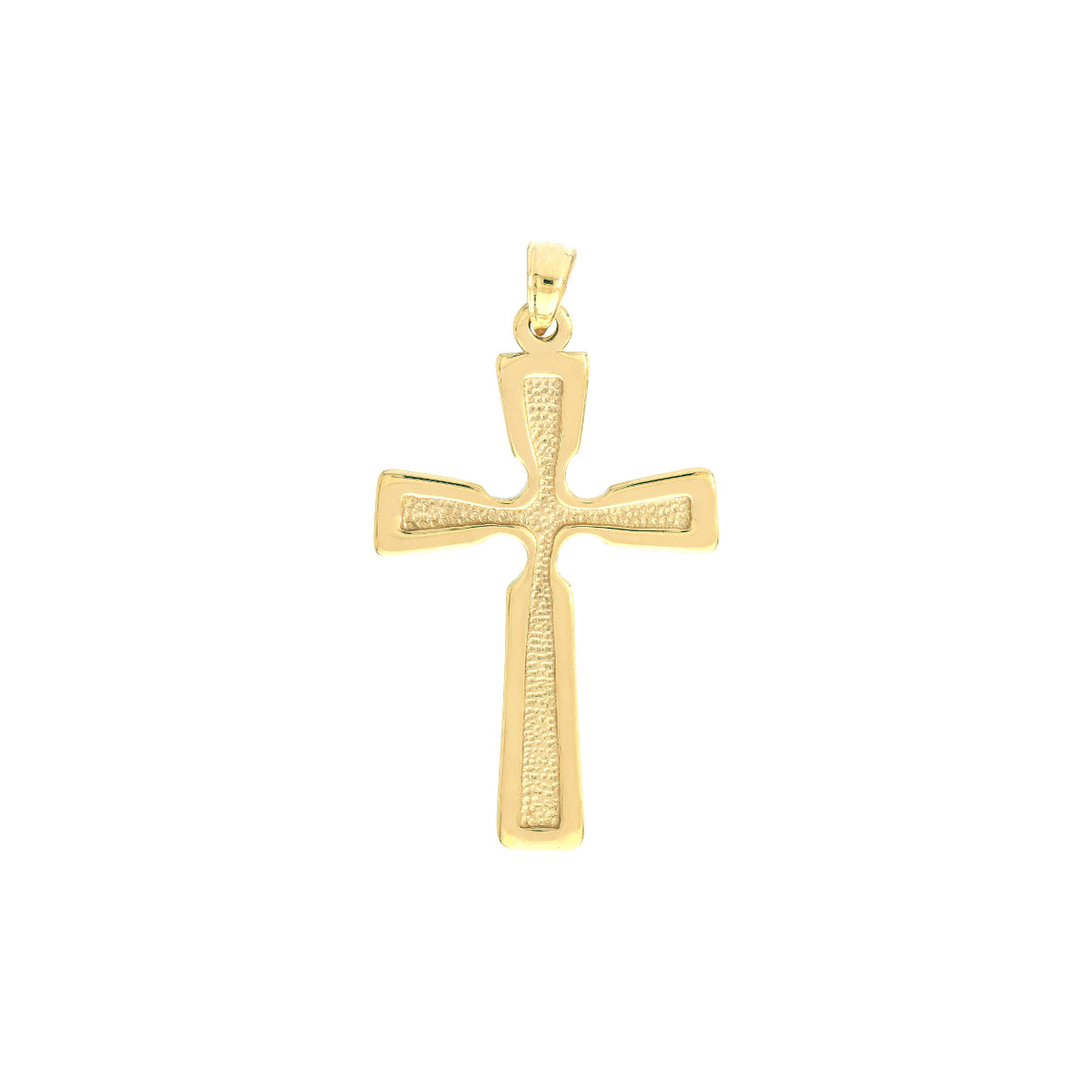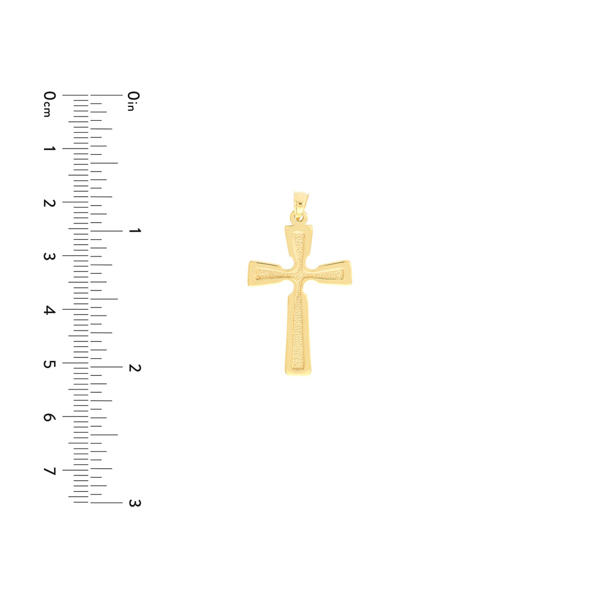 This elegant cross pendant is crafted from 14K yellow gold and features a combination of grooved and polished textures, creating a visually captivating design. Its simple yet striking form makes it a versatile piece for everyday wear or special occasions. It’s a thoughtful gift for any occasion, symbolizing faith and personal style.