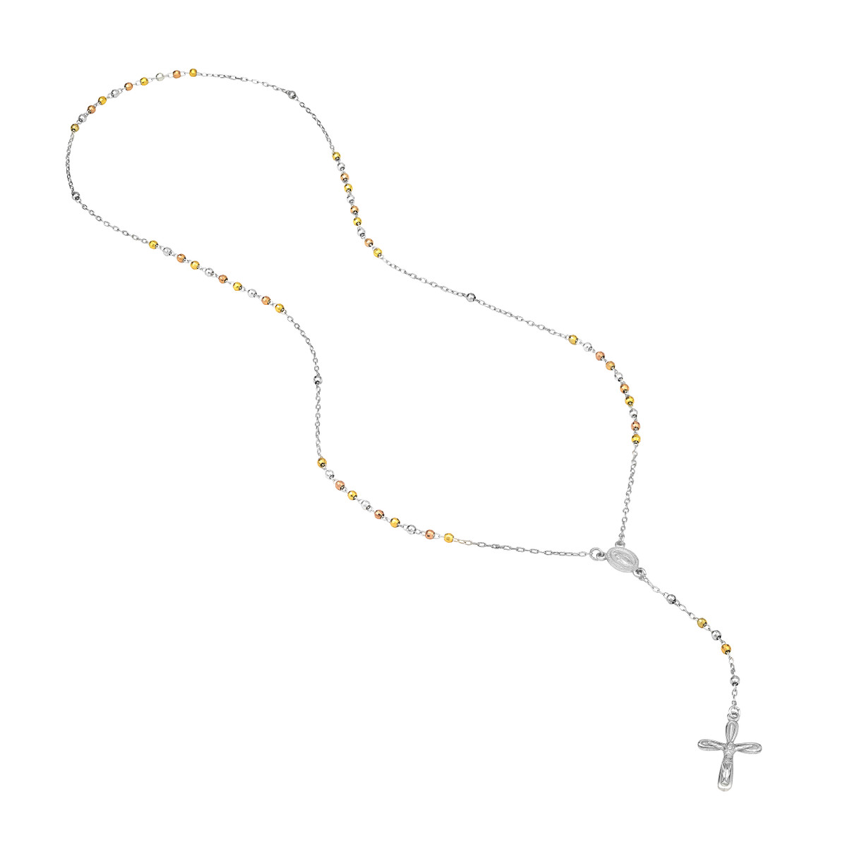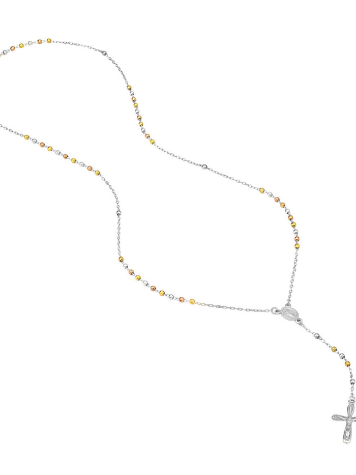 Adorn yourself with this beautiful Three Tone Sterling Silver 3mm Rosary Necklace. Crafted with meticulous attention to detail, this necklace features shimmering 3mm rosary beads, rhodium plated for a stunning shine, and a secure spring ring closure. The 26-inch rope chain drapes gracefully, making it a perfect everyday accessory or a meaningful reminder of your faith.