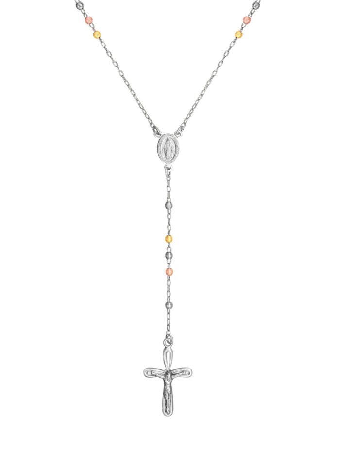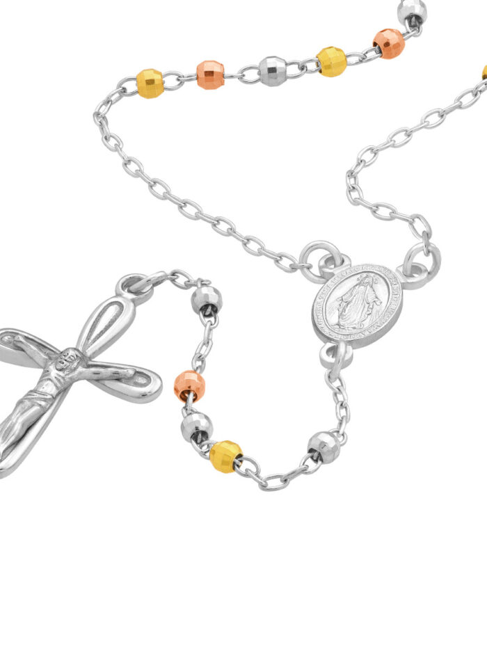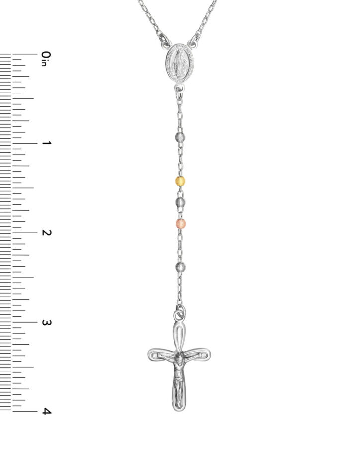 Adorn yourself with this beautiful Three Tone Sterling Silver 3mm Rosary Necklace. Crafted with meticulous attention to detail, this necklace features shimmering 3mm rosary beads, rhodium plated for a stunning shine, and a secure spring ring closure. The 26-inch rope chain drapes gracefully, making it a perfect everyday accessory or a meaningful reminder of your faith.