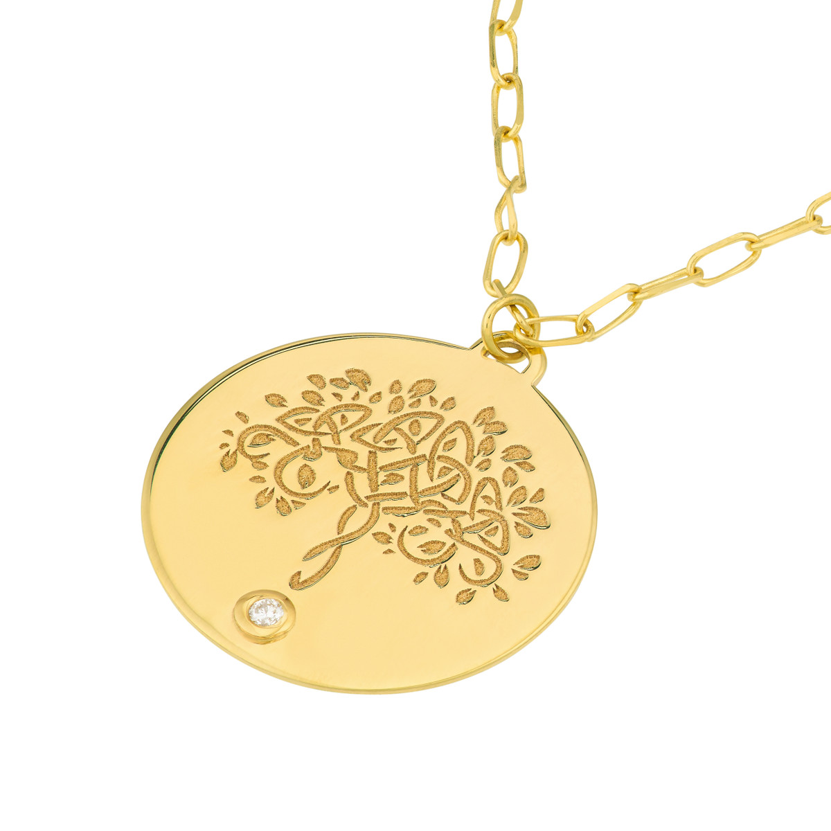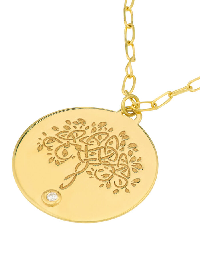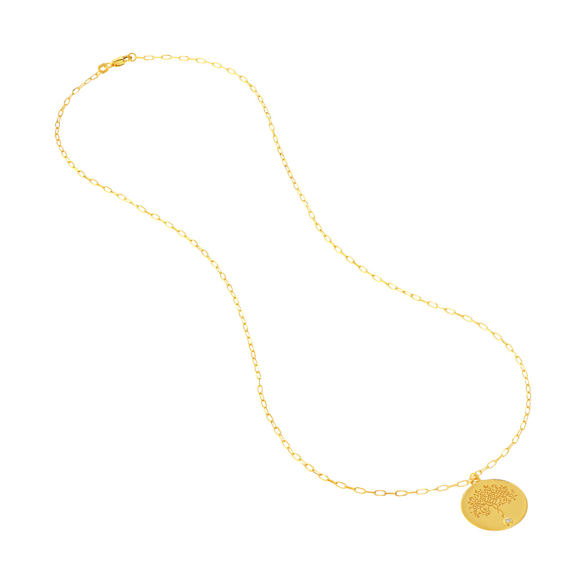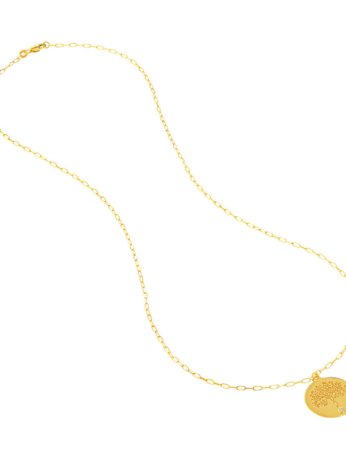 Embrace timeless elegance with our Tree of Life Diamond Pendant Necklace. Crafted from gleaming 14K yellow gold, this exquisite pendant features a captivating Tree of Life motif accented by a sparkling 1.5pt diamond. Suspended from a delicate box chain, this necklace gracefully drapes at 22 inches. The Tree of Life symbolizes strength, growth, and connection, making this piece a meaningful and beautiful addition to any jewelry collection.
