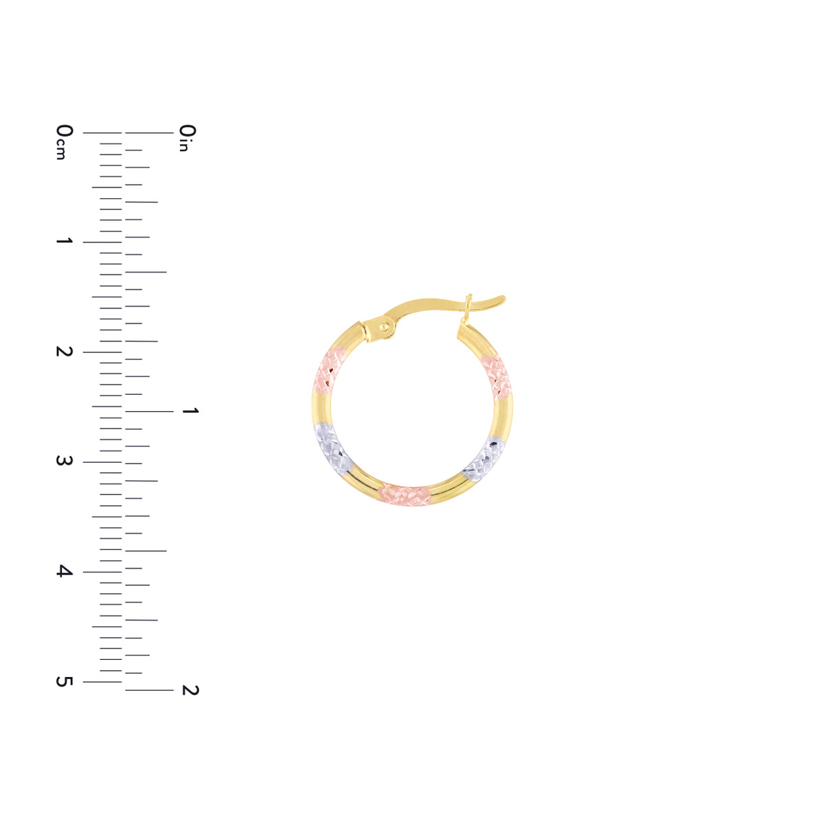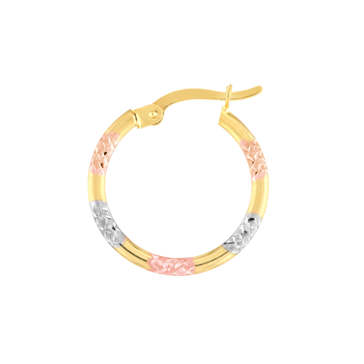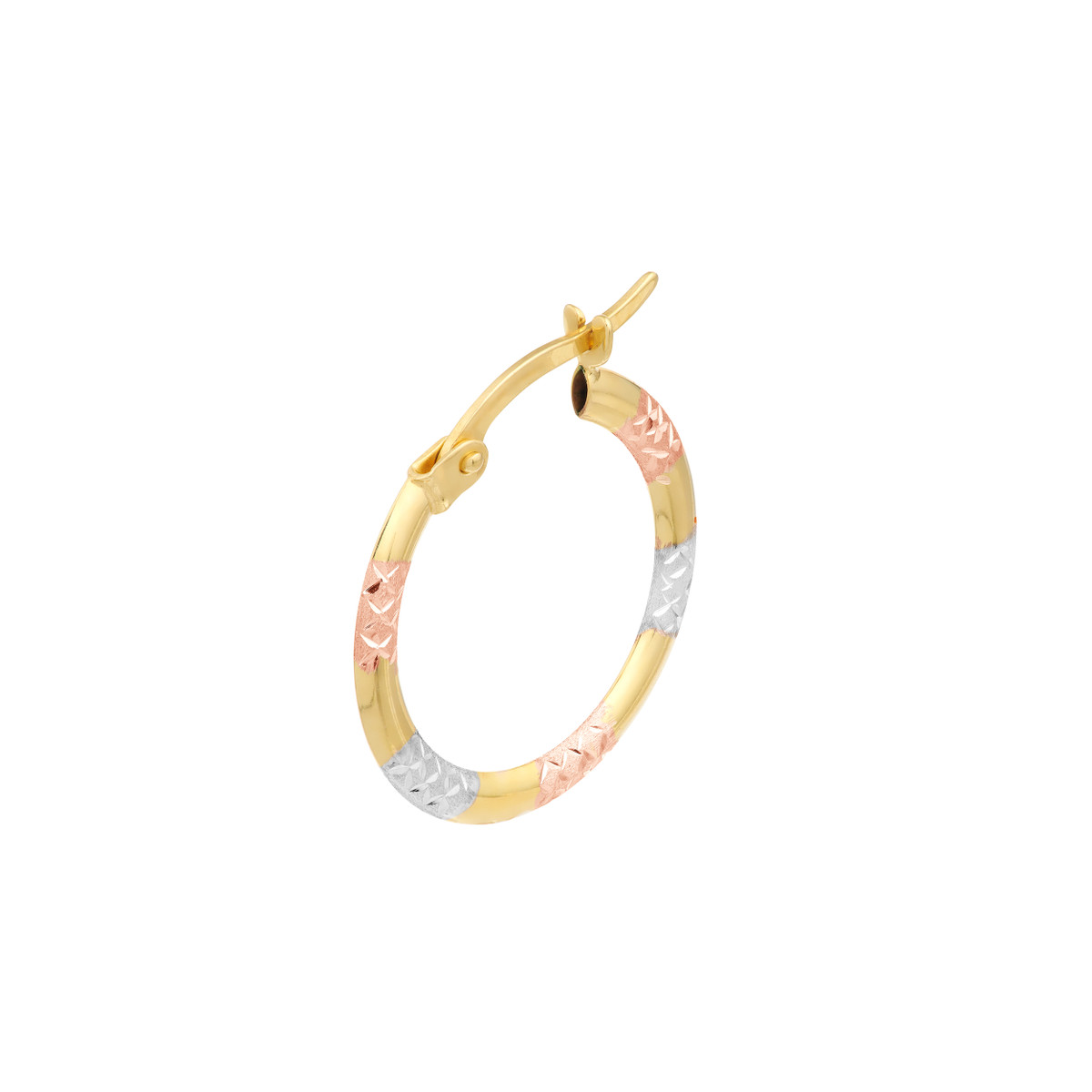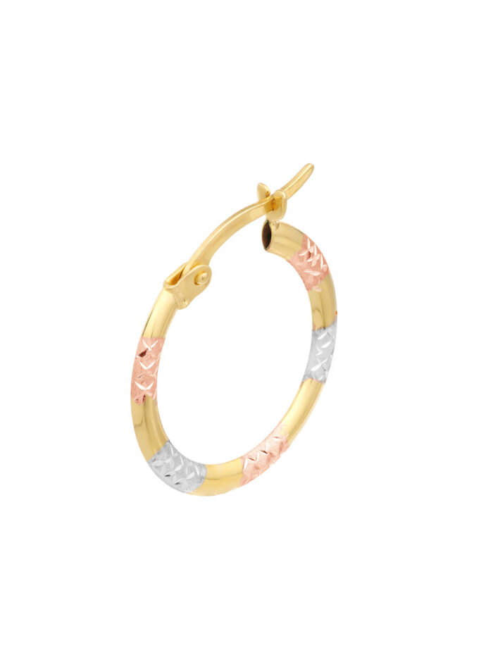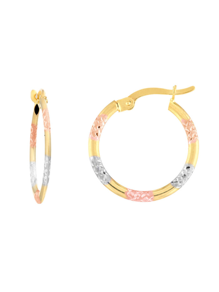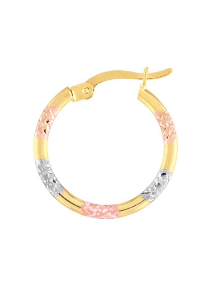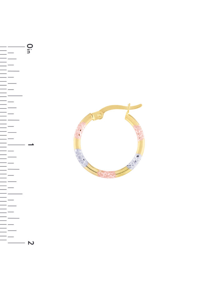 These stunning three-tone diamond-cut patterned hoop earrings are a unique and eye-catching addition to your jewelry collection. Crafted in 10K yellow, white, and rose gold, they offer a beautiful blend of warmth and cool tones. The intricate diamond-cut pattern adds sparkle and dimension, while the lightweight design ensures comfortable wear.