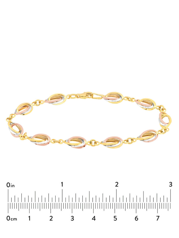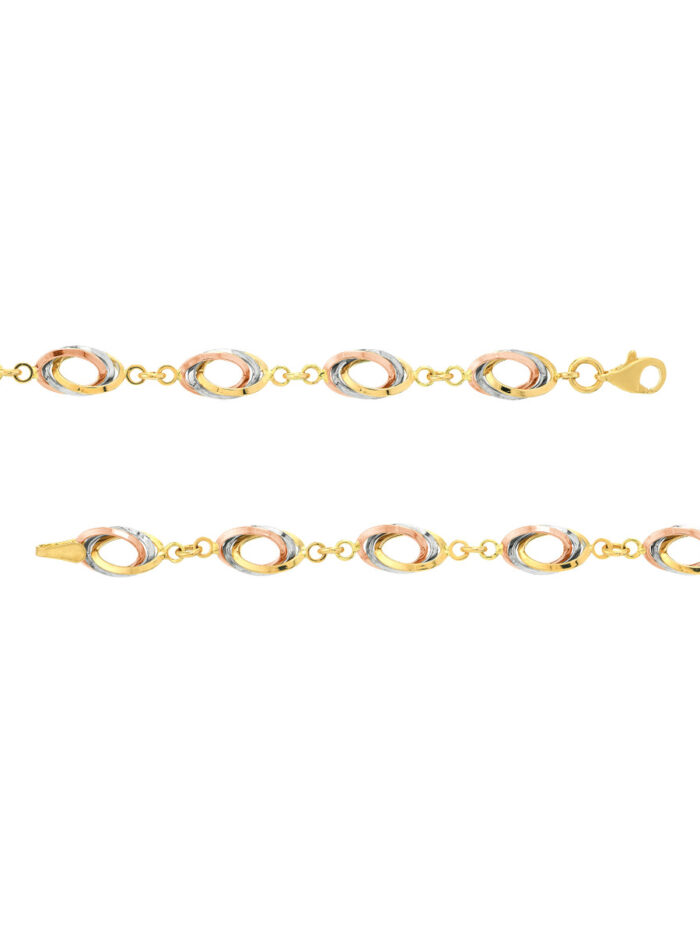 Add a touch of modern glamour to your wrist with our Tri-Color Interwoven Triple Oval Link Bracelet. This striking bracelet features intricately woven triple oval links in lustrous yellow, white, and rose gold, creating a breathtaking display of color and texture. The secure lobster clasp ensures a comfortable and confident fit. This bracelet is a statement piece that effortlessly elevates any outfit.