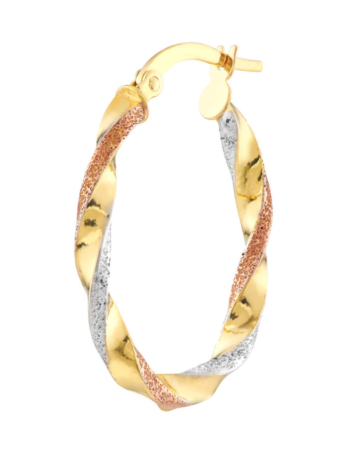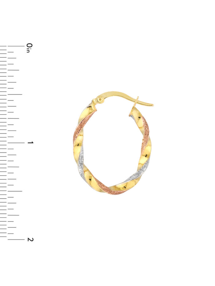 Add a touch of romance to your look with these beautiful tri-color twisted oval hoop earrings. Crafted in 14K yellow, white, and rose gold, these earrings effortlessly elevate any outfit. Their twisted design adds a touch of femininity and movement, making them perfect for both casual and dressy occasions.
