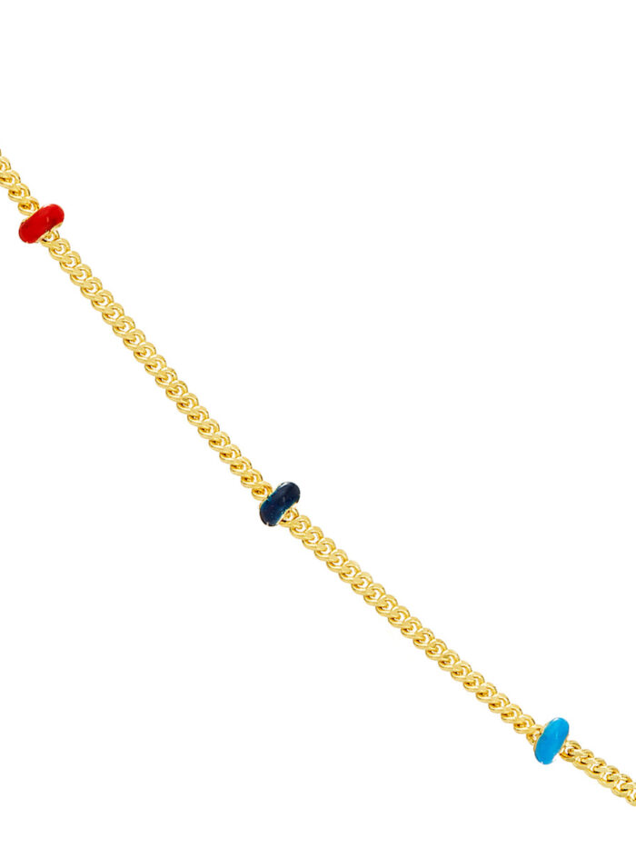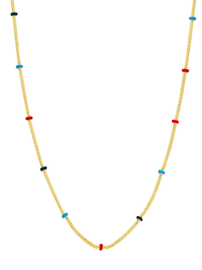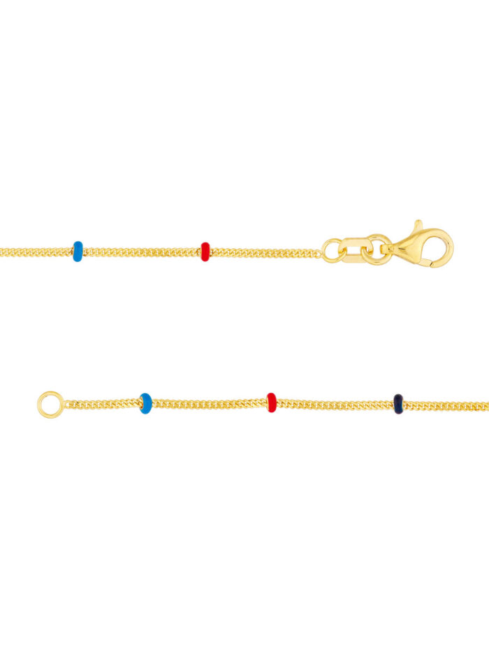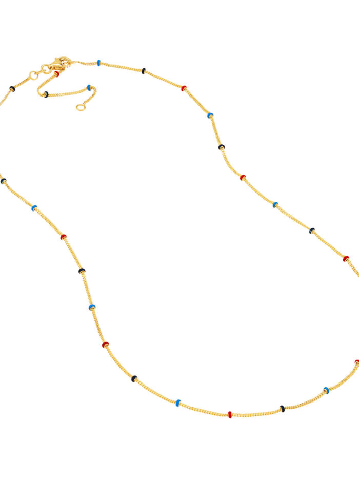 Shine bright with the Tri-colored Enamel Bead Saturn Chain. This eye-catching necklace features handcrafted enamel beads in vibrant colors, strung on a delicate Saturn chain crafted in 14K gold. Adjustable from 14 to 18 inches, you can customize the fit to your preference. Express your unique style with this stunning statement piece.