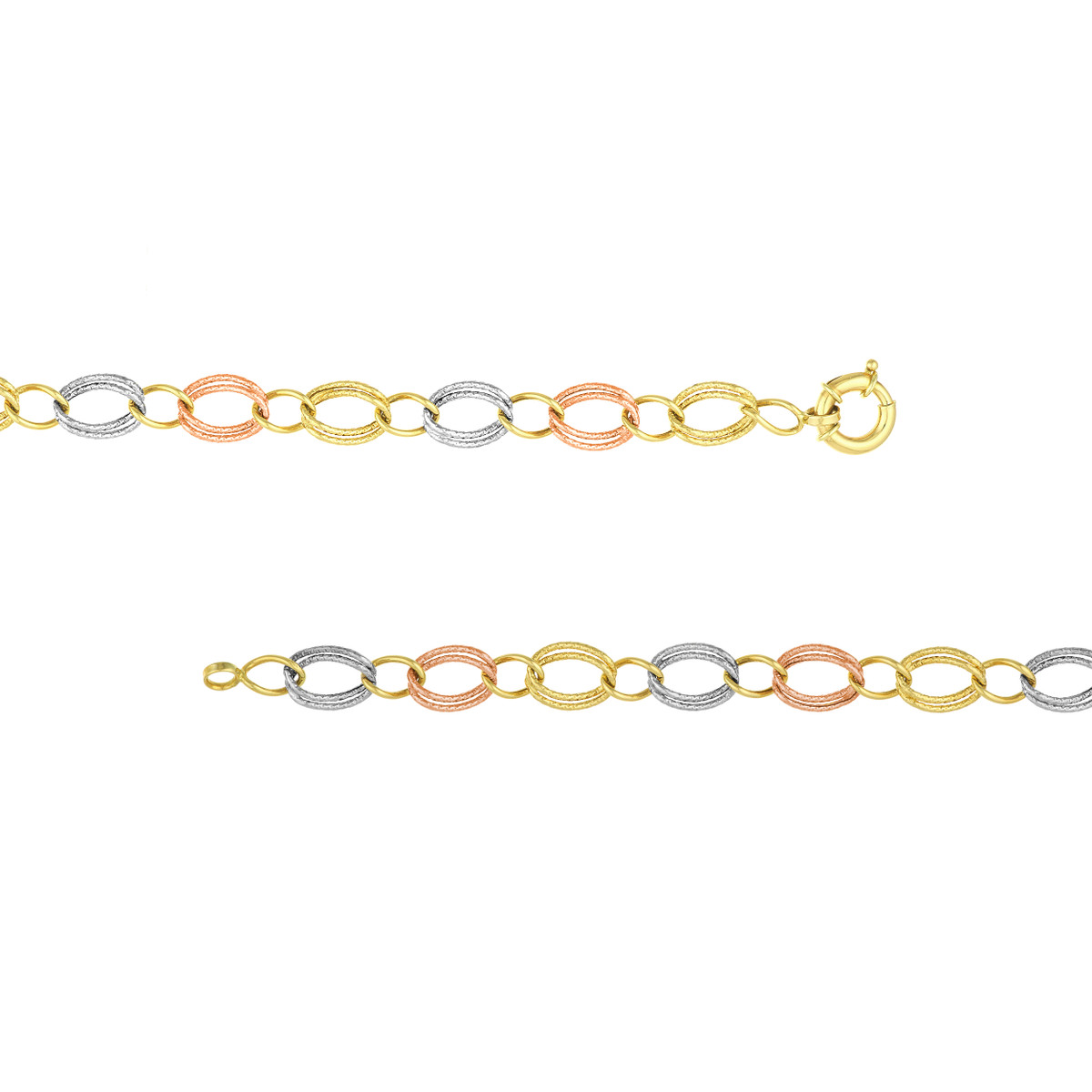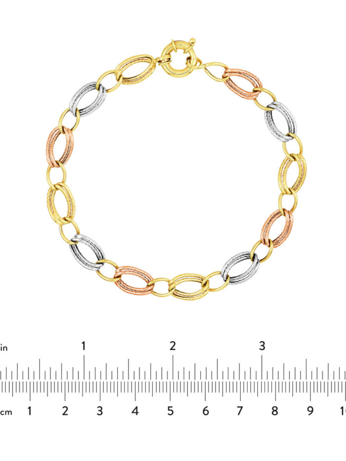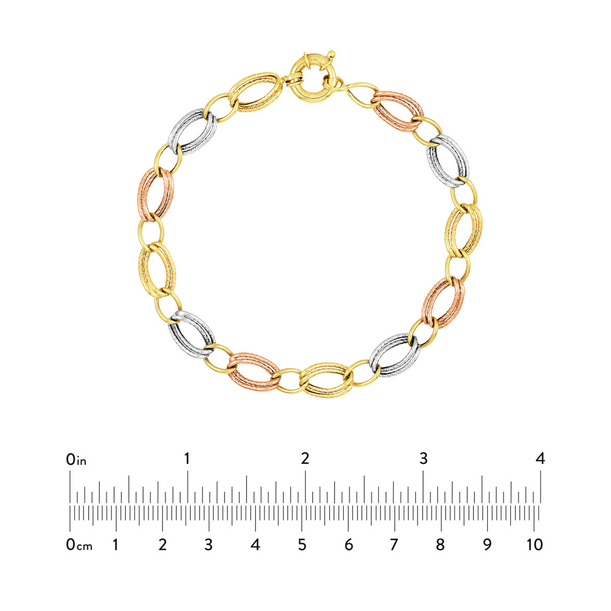 Elevate your jewelry collection with this exquisite Tri-Colored Textured Link Bracelet. Made from 14K yellow, white, and rose gold, this bracelet boasts a unique textured link design that adds visual interest and dimension. The Fancy Spring Ring Closure ensures a secure and easy-to-wear experience.