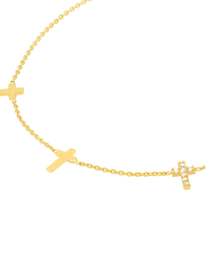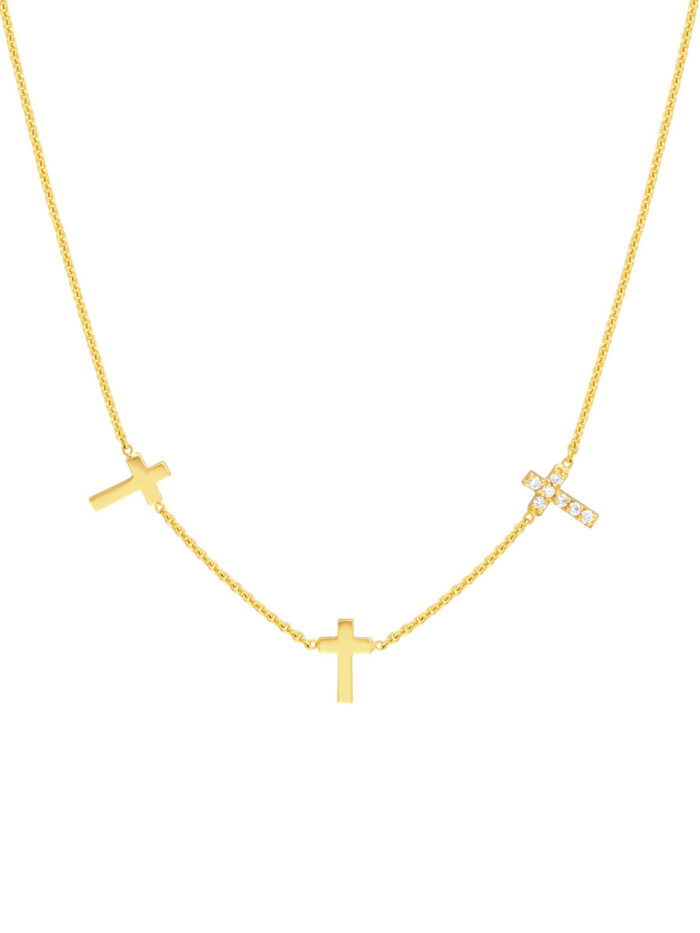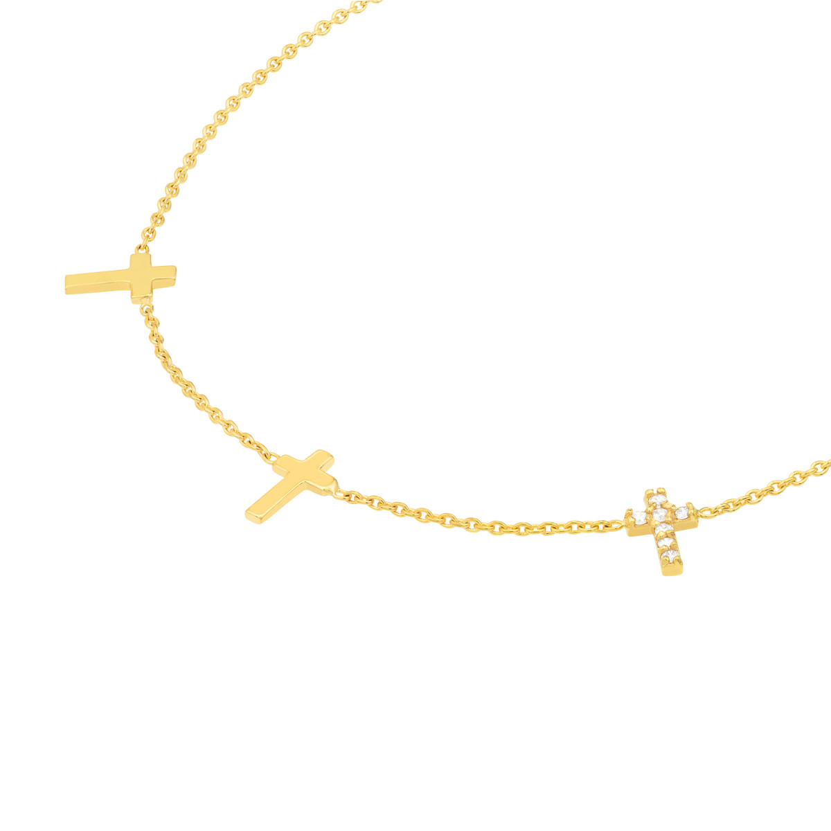 Embrace spirituality and style with the Triple Cross with Diamond Necklace. This 14K yellow gold necklace features a trio of crosses, two polished and one adorned with a sparkling 1/15ctw diamond. The elegant cable chain adds a touch of sophistication, while the adjustable length (18 inches) ensures a perfect fit.