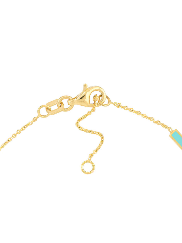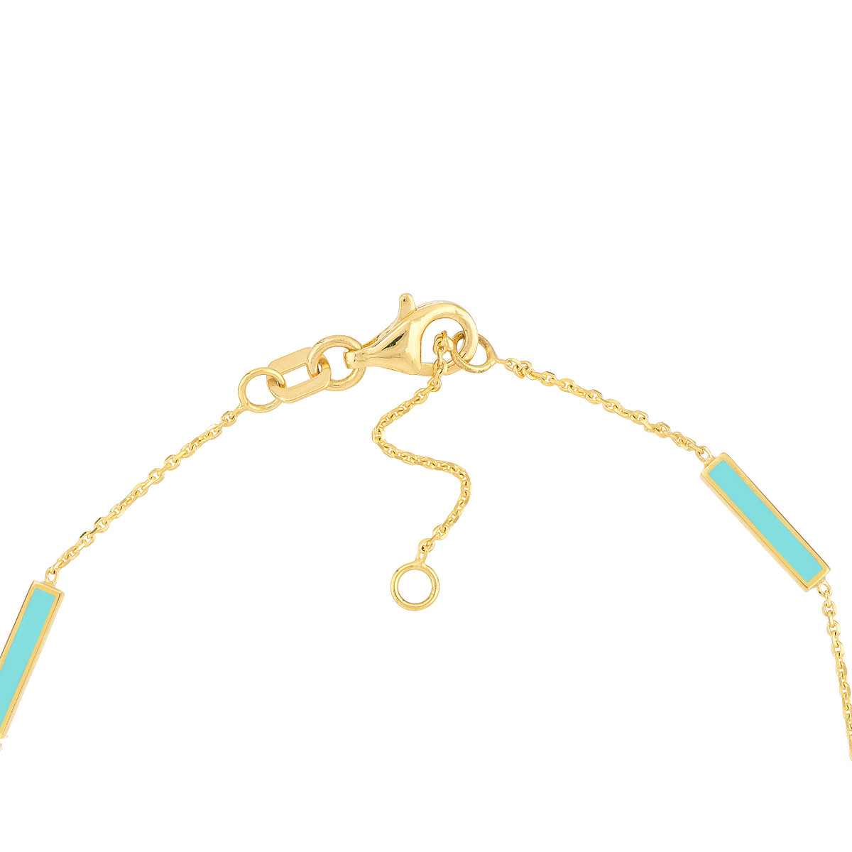 Embrace the vibrant allure of our Turquoise Enamel Alternating Bar Station Bracelet. This stunning piece from the Color Romance Collection features alternating turquoise enamel bars on a delicate box chain, creating a playful yet sophisticated look. Crafted in lustrous 14K yellow gold, it’s designed for a comfortable and stylish wear. The 1-inch adjustable feature allows for a perfect fit, making it a versatile accessory for any occasion.