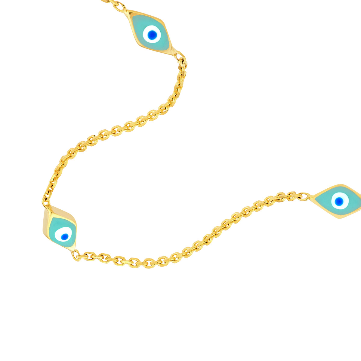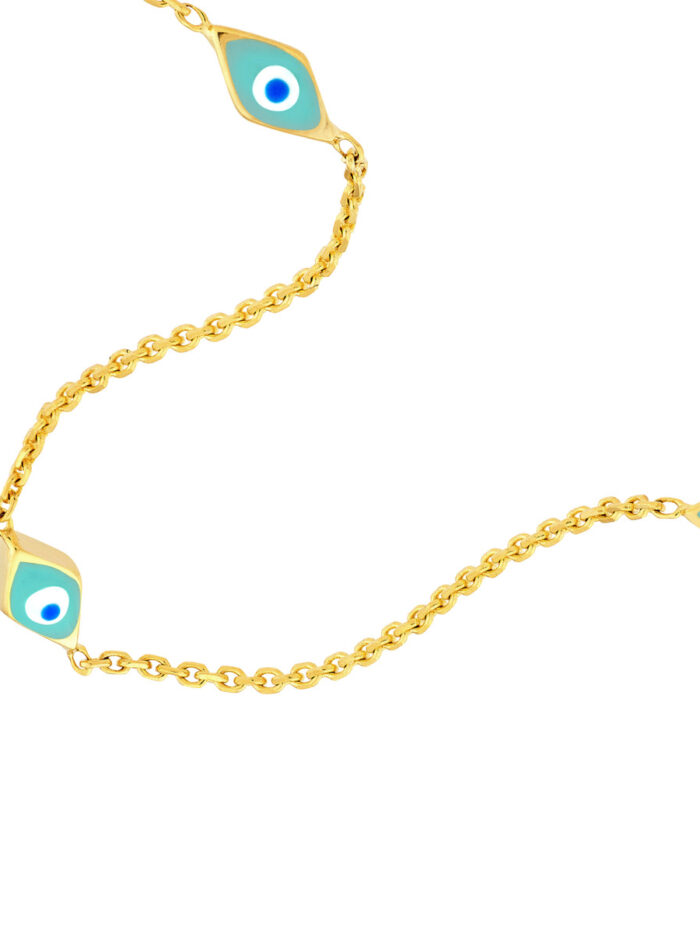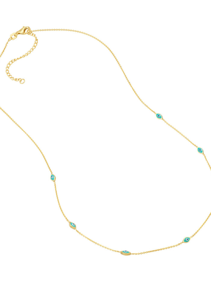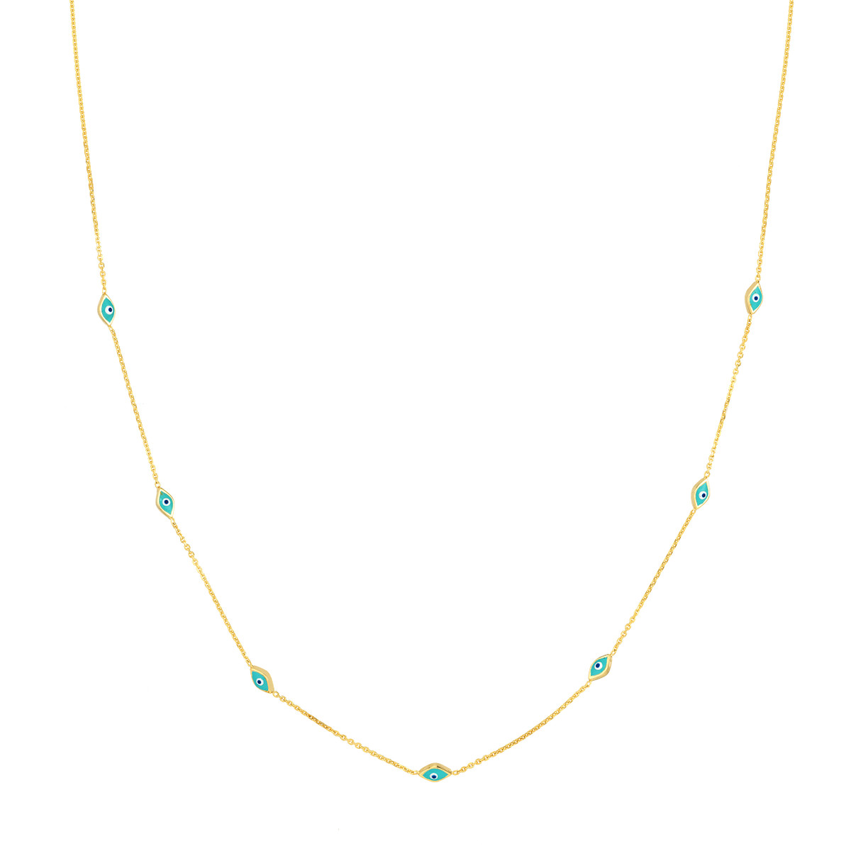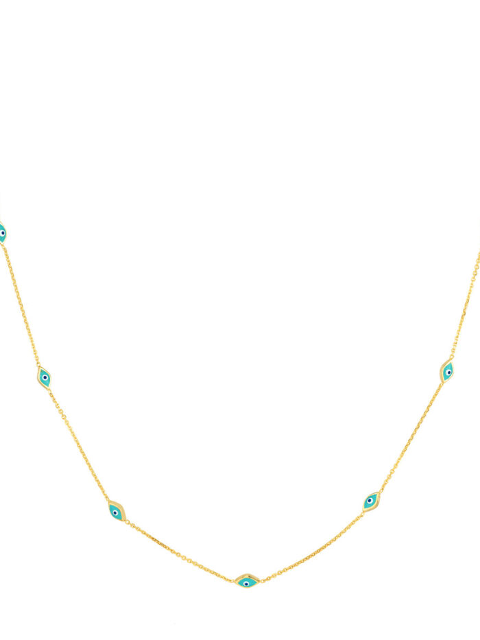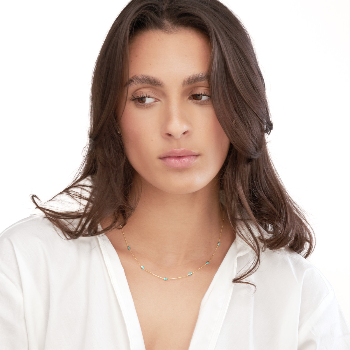 Embrace protection and style with our Turquoise Enamel Evil Eye Station Necklace. This eye-catching necklace features seven evil eye stations adorned with vibrant turquoise enamel, believed to ward off negative energy. Crafted from lustrous 14K yellow gold and set on a delicate cable chain, it adds a touch of mystical charm to any outfit. The adjustable clasp allows for a personalized fit.