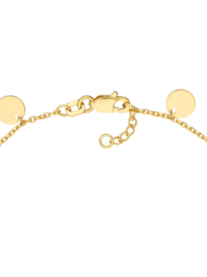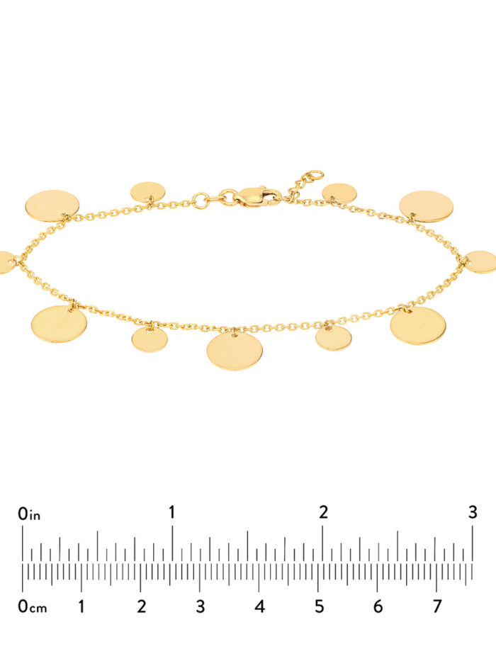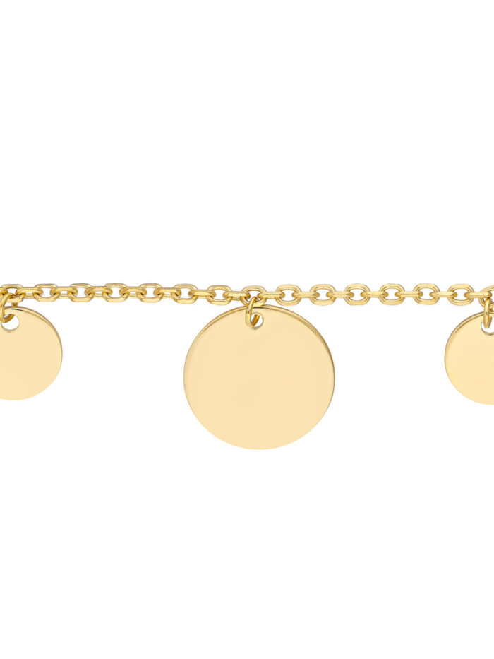 Make a statement with our Two-Sized Dangle Disc Chain Bracelet. This classic gold bracelet is crafted from shimmering 14K yellow gold and features eye-catching dangle discs in two sizes for added dimension. The choker chain sits beautifully on the wrist, adding a touch of sophistication to any outfit. With its adjustable design, this bracelet is a versatile piece that can be worn both casually and dressy.