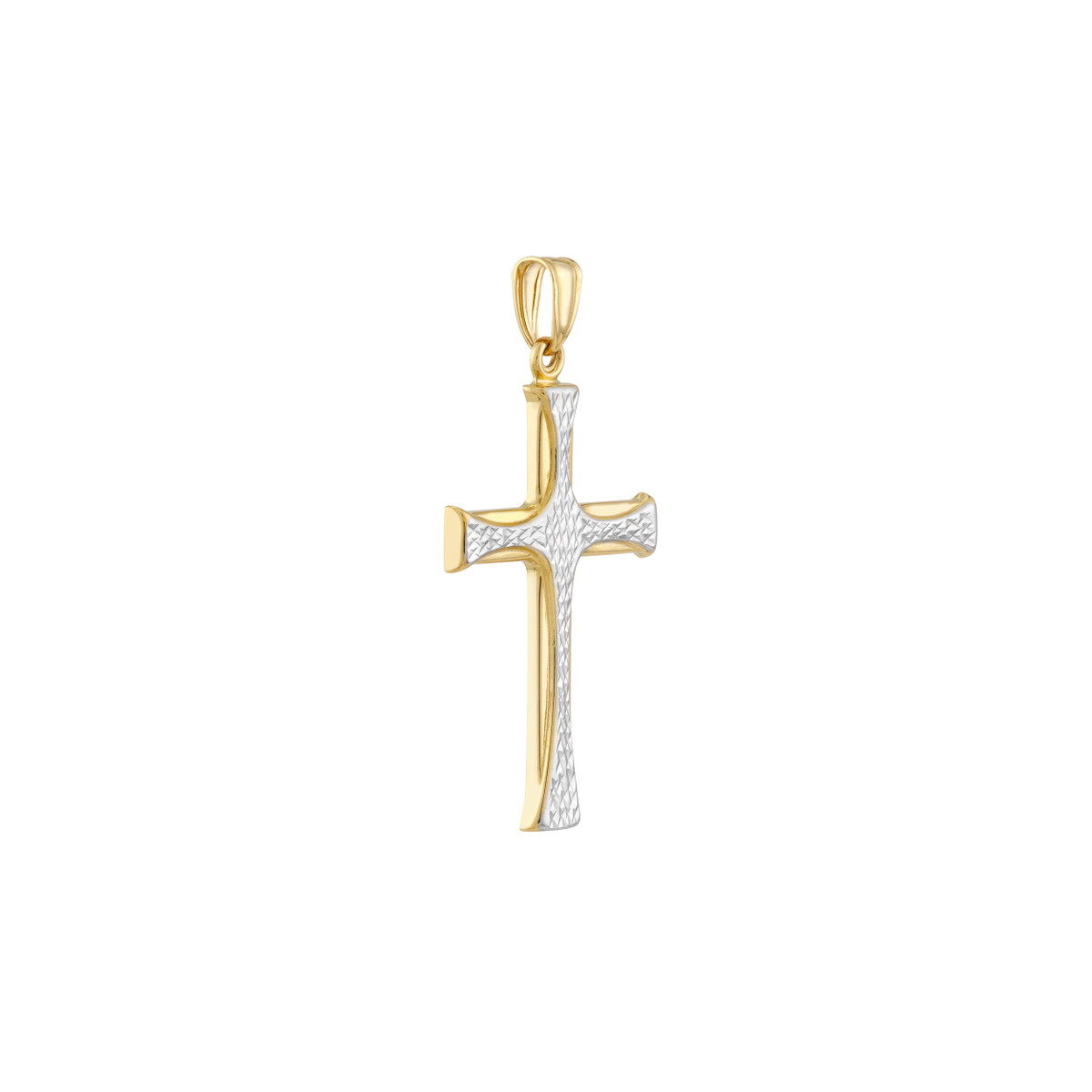 This stunning two-tone cross pendant combines the brilliance of diamond-cut white gold with the elegance of polished yellow gold. A timeless design, it’s perfect for adding a touch of faith and sophistication to any outfit. Crafted from 14K gold, this pendant is both durable and beautiful, making it a treasured gift for any occasion.
