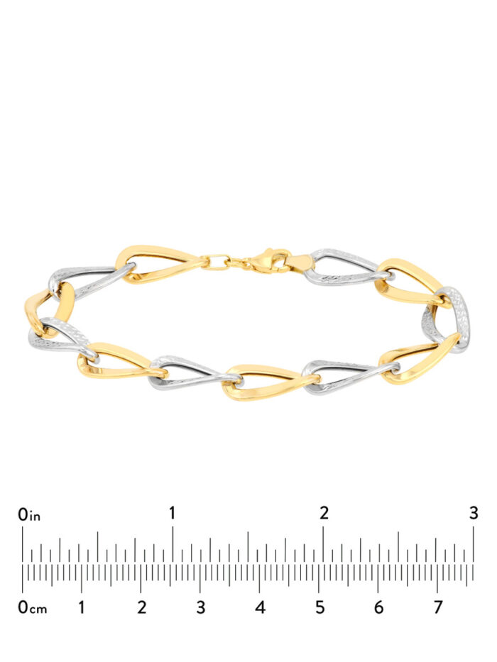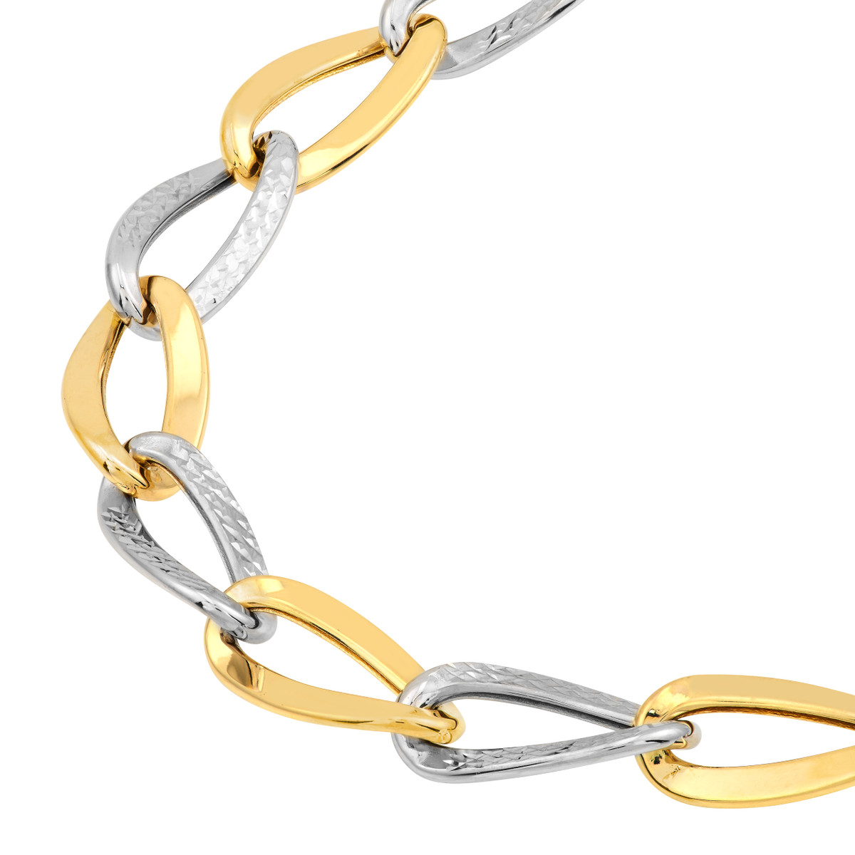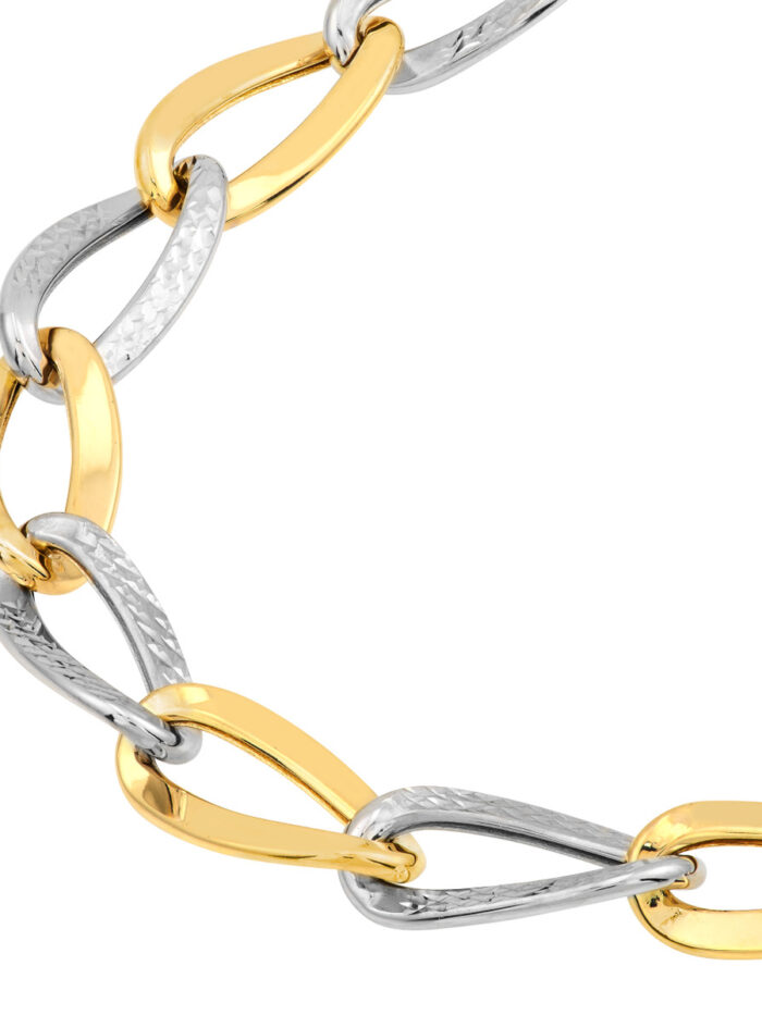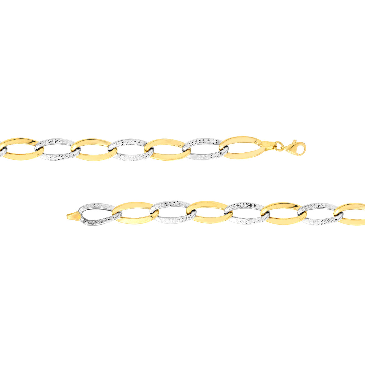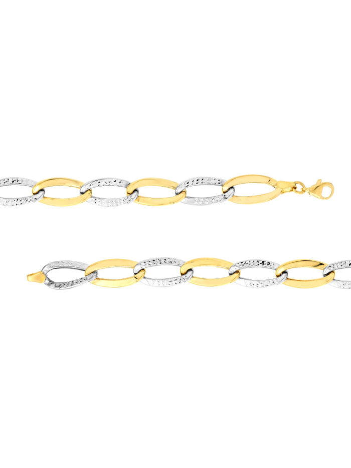 Make a statement with our Two-Tone Alternating Open Oval Link Bracelet. This dazzling bracelet features a stunning blend of open oval links in alternating yellow and white gold, creating a captivating interplay of light and texture. The secure lobster clasp ensures a comfortable and confident fit. This bracelet is the perfect way to elevate your everyday style.