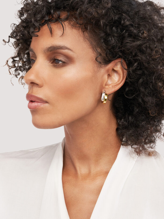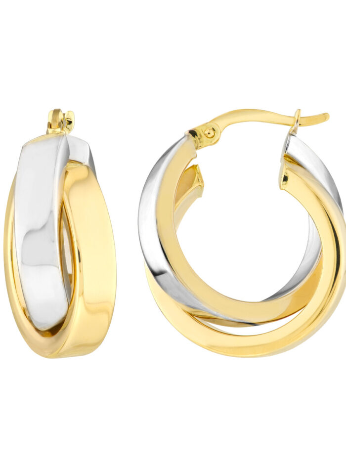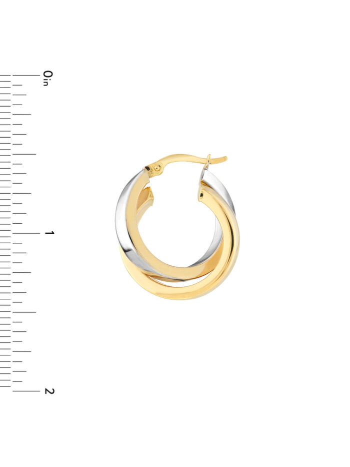Add a touch of modern elegance to your look with these stunning two-tone criss-cross hoop earrings. Crafted from lustrous 14K yellow and white gold, these 15mm hoops feature a unique criss-cross pattern that adds a touch of interest and dimension. The hinge closure ensures a secure and comfortable fit, while the two-tone design adds a touch of sophistication. Perfect for adding a touch of glamour to any outfit, these earrings are sure to become a favorite.