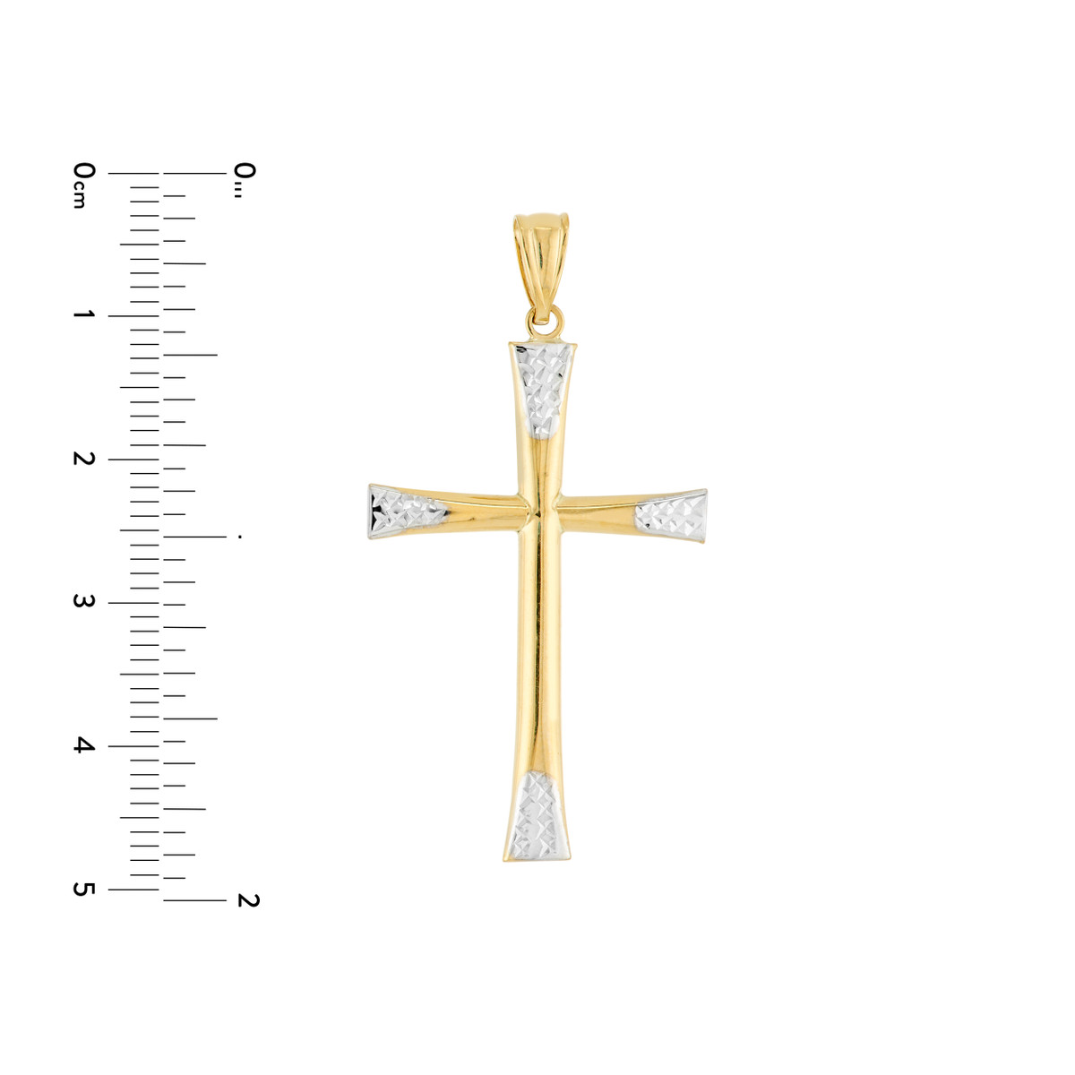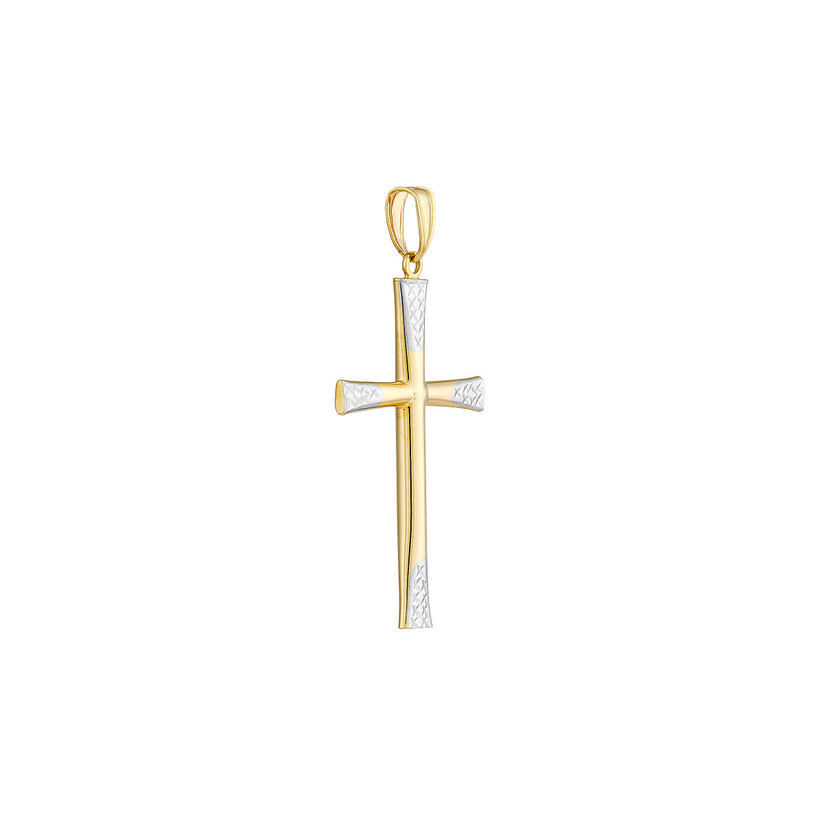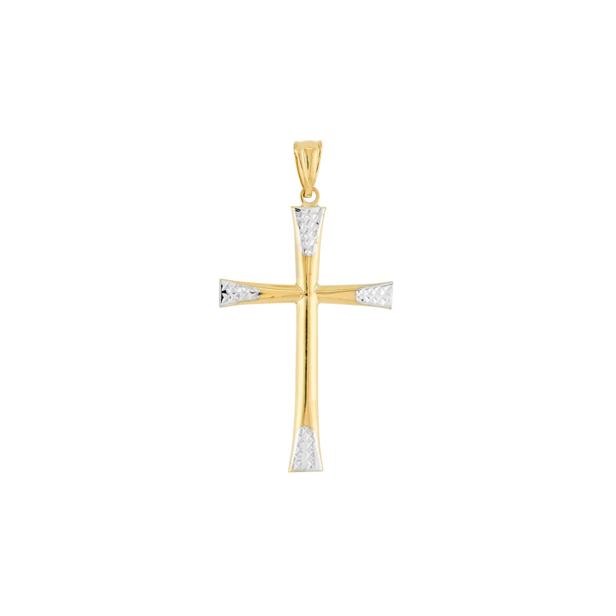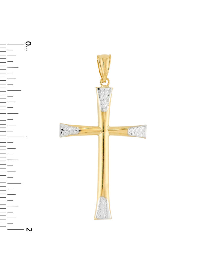 This exquisite two-tone cross pendant is crafted from lustrous 14K yellow and white gold, featuring captivating diamond-cut accents that catch the light with every movement. The classic cross design symbolizes faith and devotion, making it a meaningful gift for any religious occasion. Suspended from a delicate bail, this pendant adds a touch of elegance to any necklace chain.