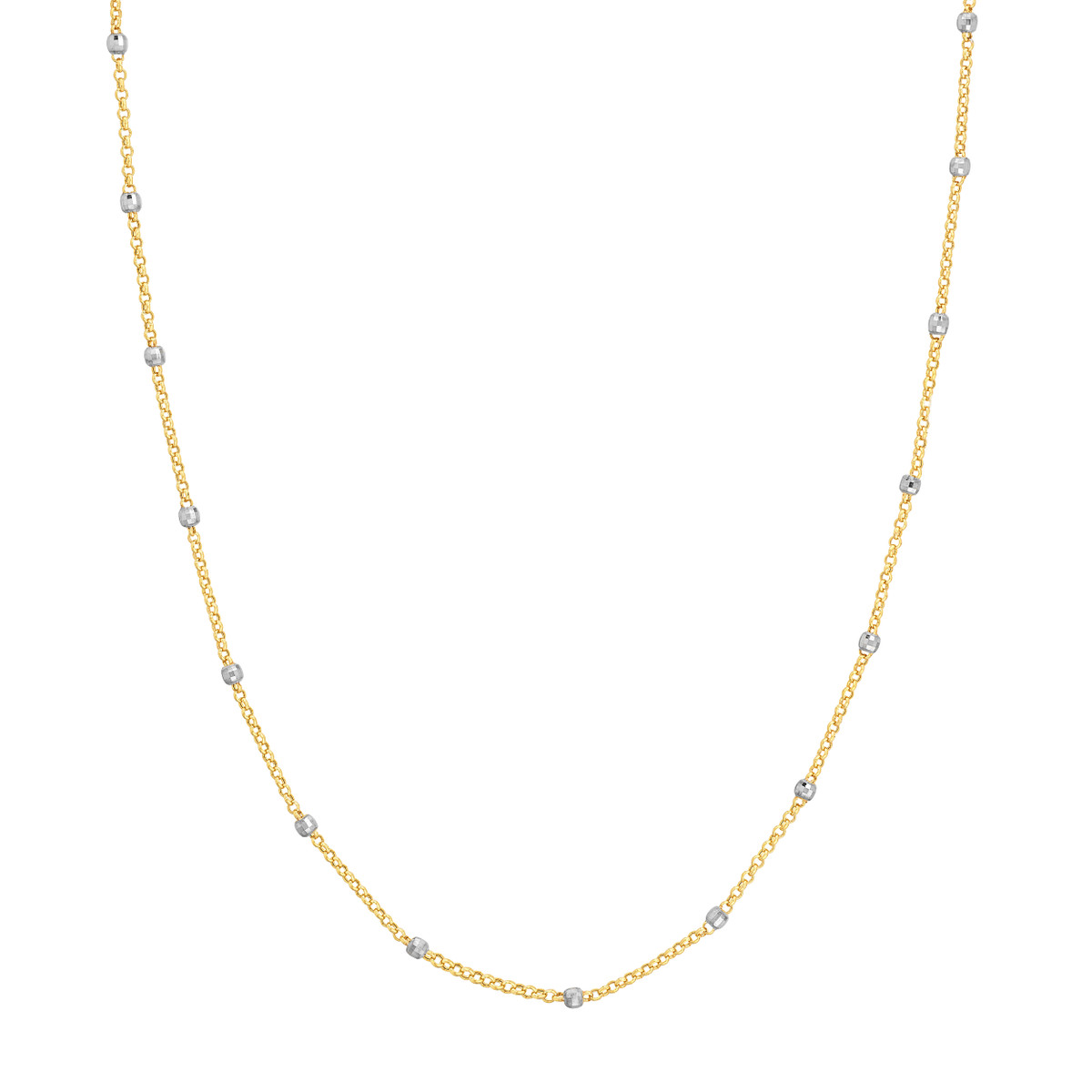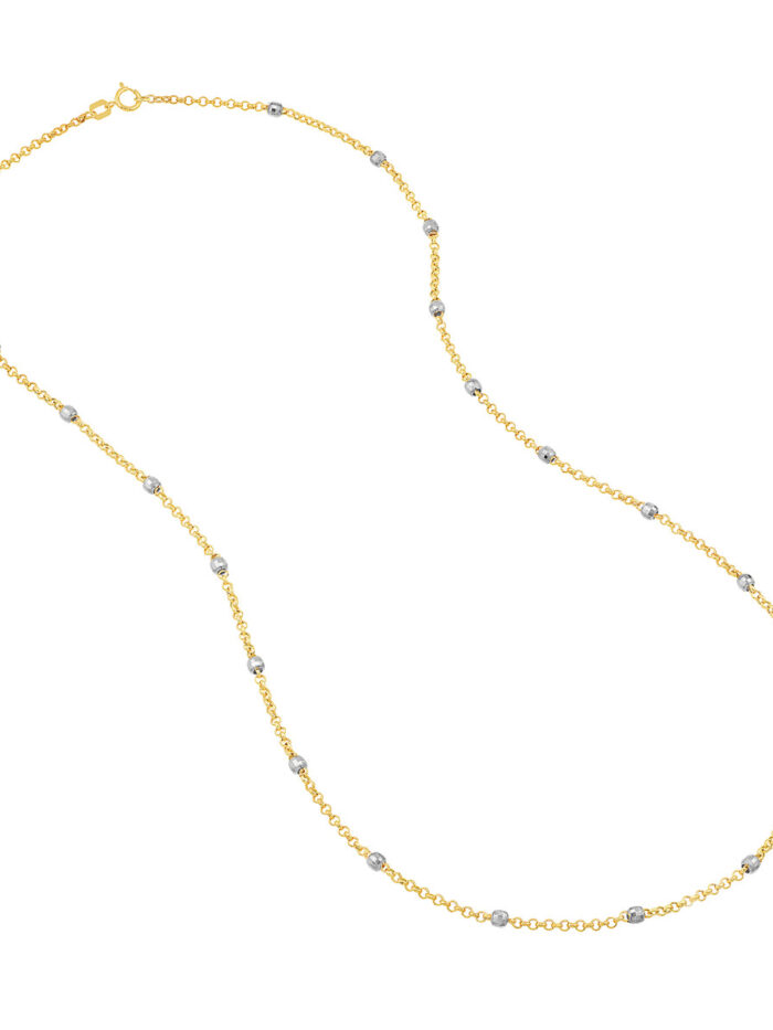 Add a touch of modern glamour to your look with the Two-Tone Disco Bead Rolo Chain Necklace. This stylish necklace features eye-catching 3mm disco beads in alternating yellow and white gold, strung on a sleek and durable rolo chain. The combination of shimmering gold tones and the playful disco bead design creates a unique and eye-catching piece that’s perfect for both casual and dressy occasions.
