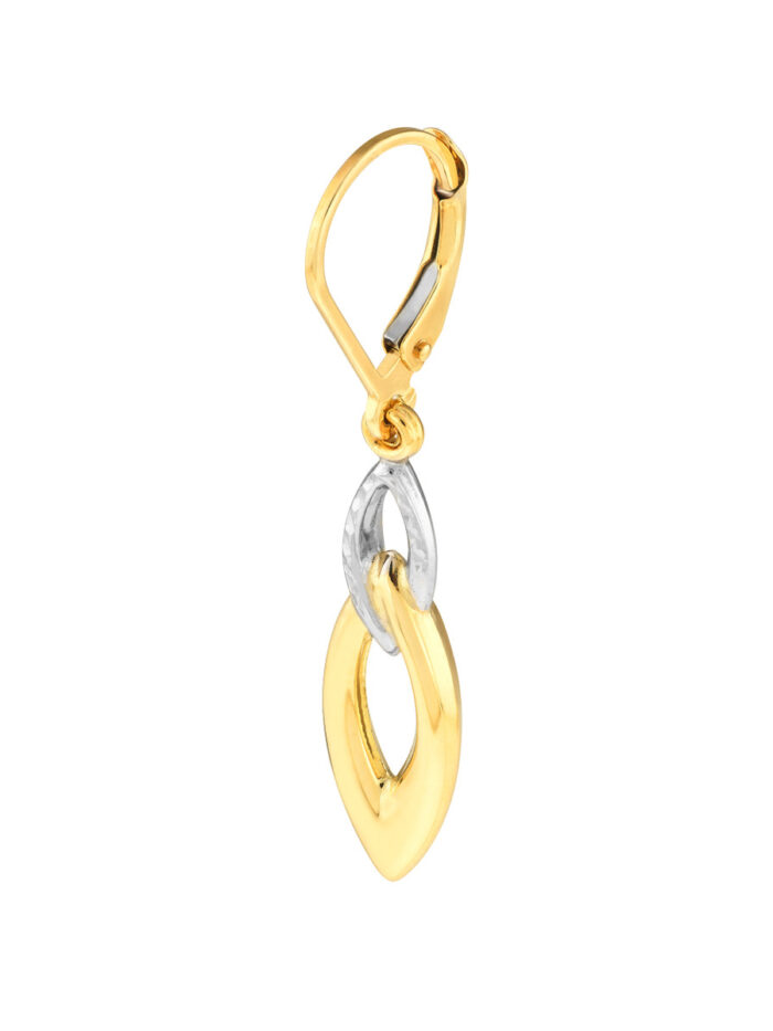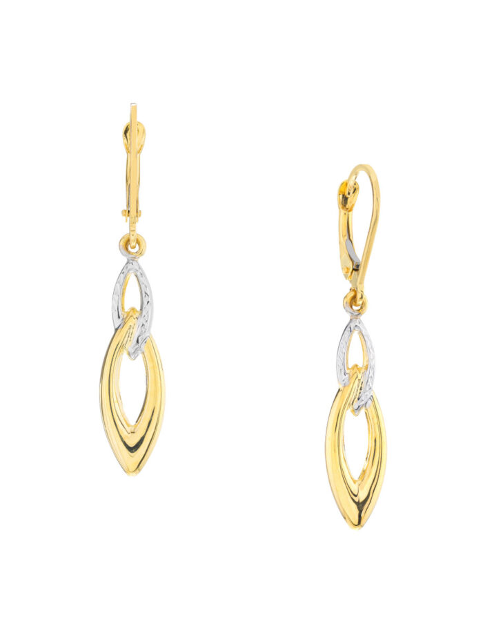 Introducing these captivating double marquise drop earrings, a stunning blend of two-tone elegance. Crafted in 10K yellow and white gold, these earrings feature polished links that create a graceful and eye-catching silhouette. The leverback closure ensures a secure and comfortable fit.