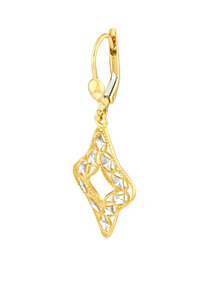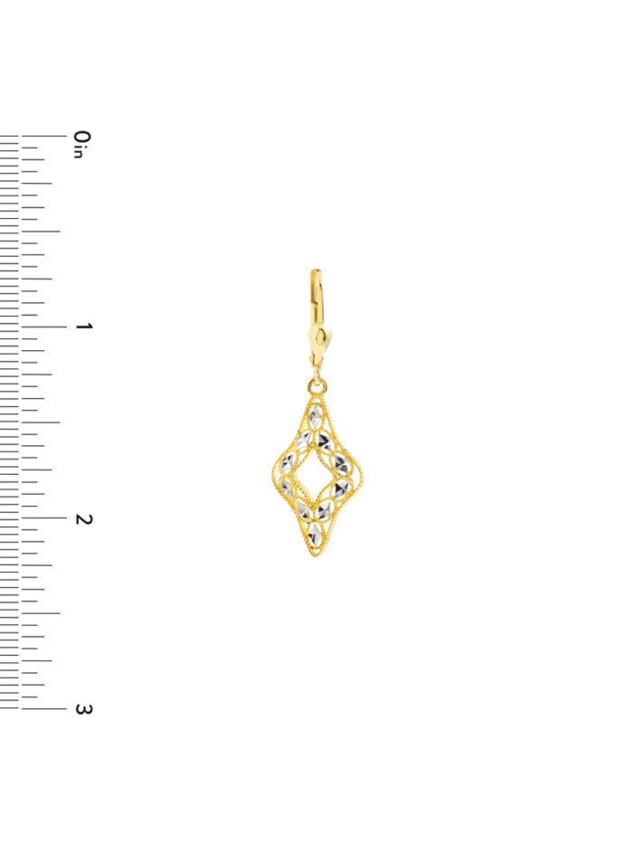 Add a touch of sparkle and elegance to your look with these beautiful two-tone filigree open diamond dangle earrings. Crafted from 14K yellow and white gold, these earrings feature a delicate filigree design accented with sparkling open diamonds. The leverback closure ensures a secure and comfortable fit. Whether you’re dressing up for a special occasion or adding a touch of glamour to your everyday style, these earrings are sure to make a statement.