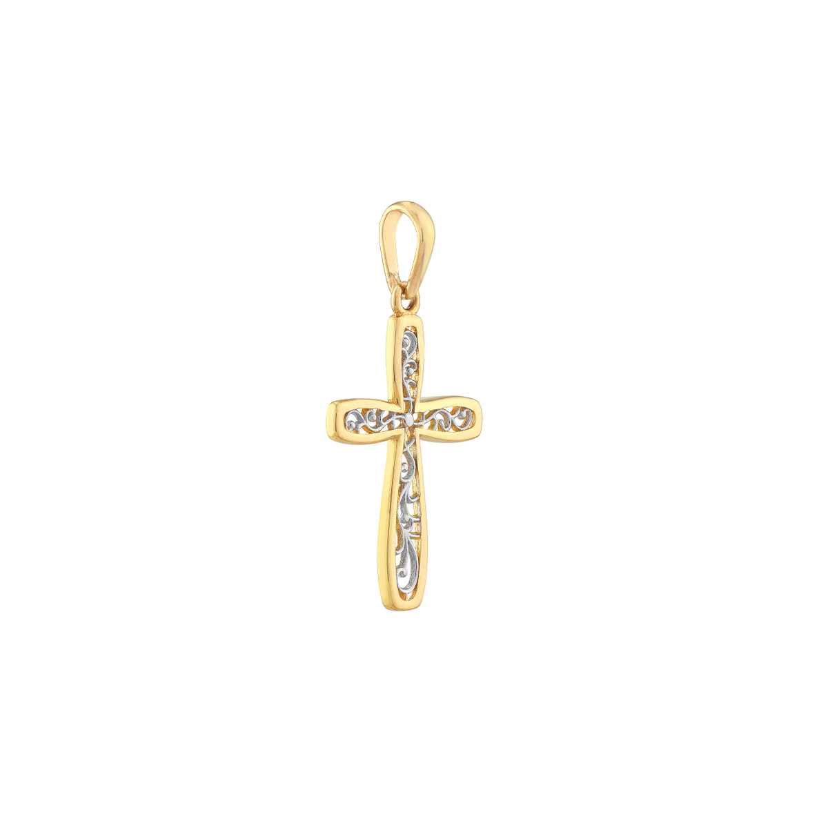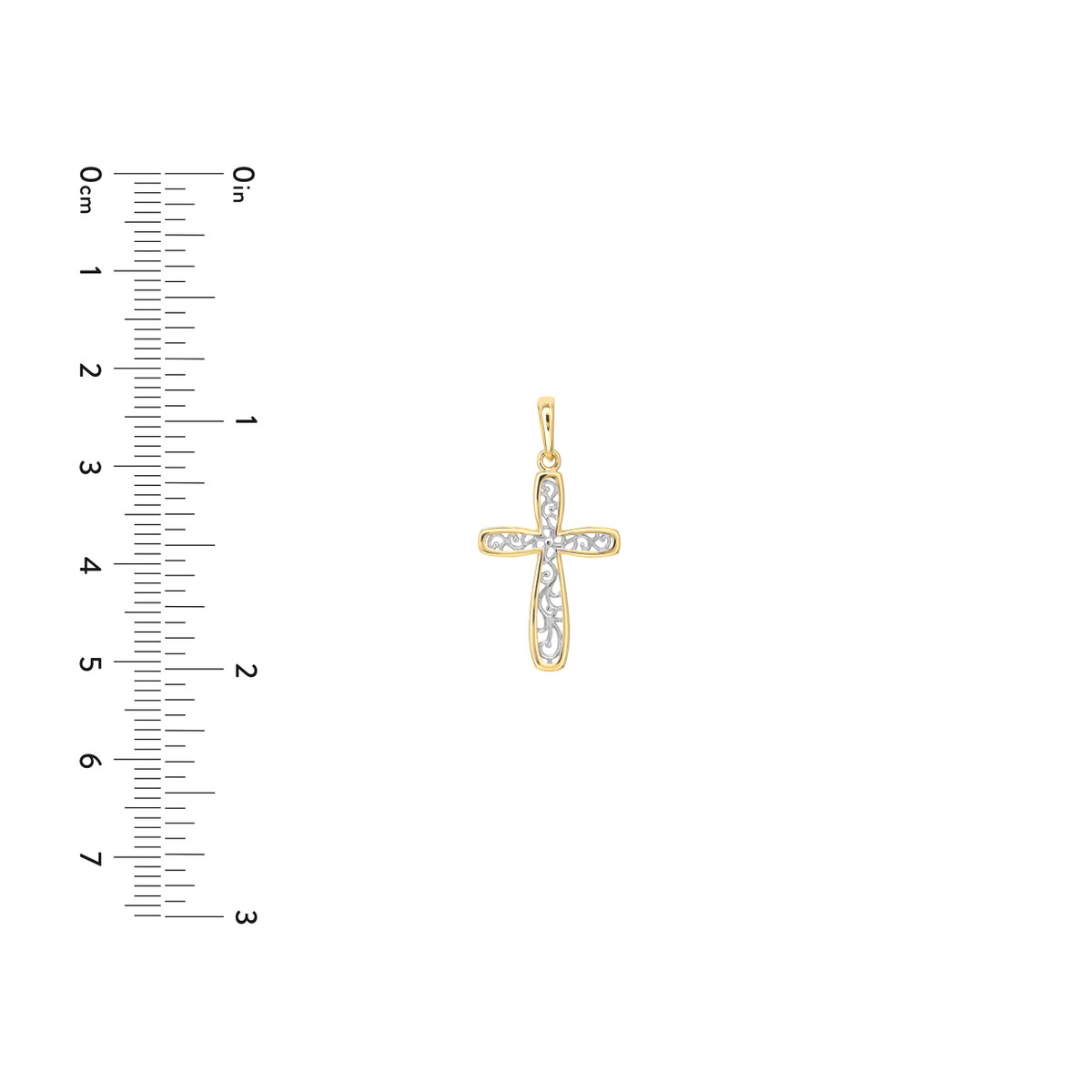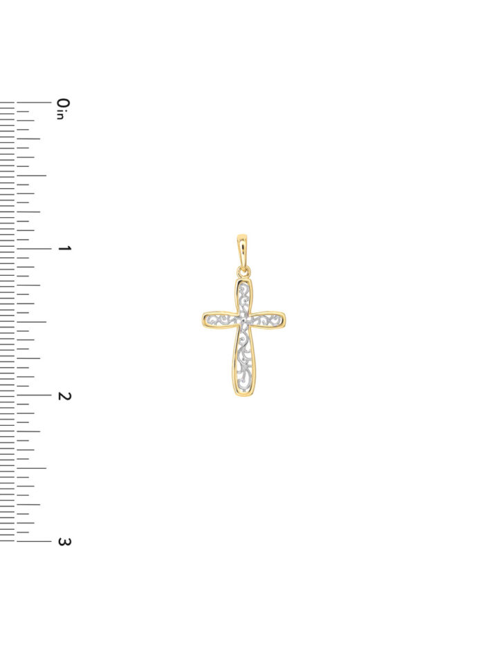 Celebrate faith and style with this exquisite two-tone cross pendant. Crafted from 14K yellow and white gold, the intricate vine design adds a touch of elegance and artistry. The unique combination of metals creates a striking visual contrast, making it a truly special piece. Perfect as a meaningful gift for religious holidays or special occasions.