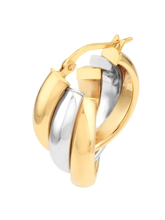 Express your love for unique style with these enchanting Two-Tone Love Knot Hoop Earrings. Crafted in 14K yellow and white gold, they feature a captivating crossover design that symbolizes eternal love. These earrings add a touch of romance and sophistication to any ensemble.