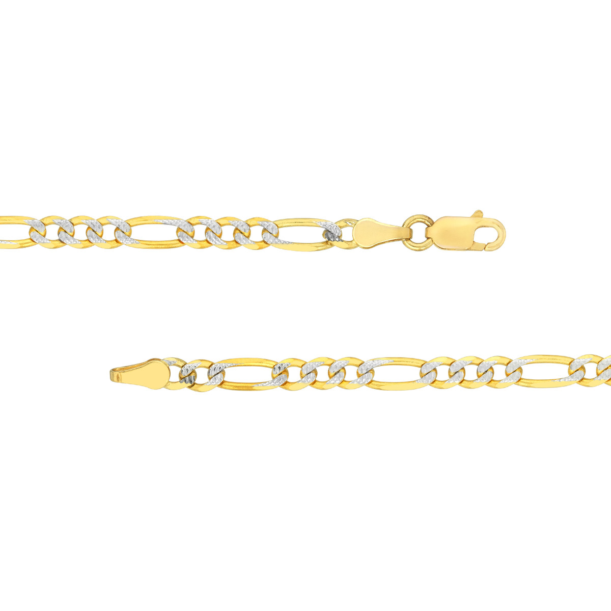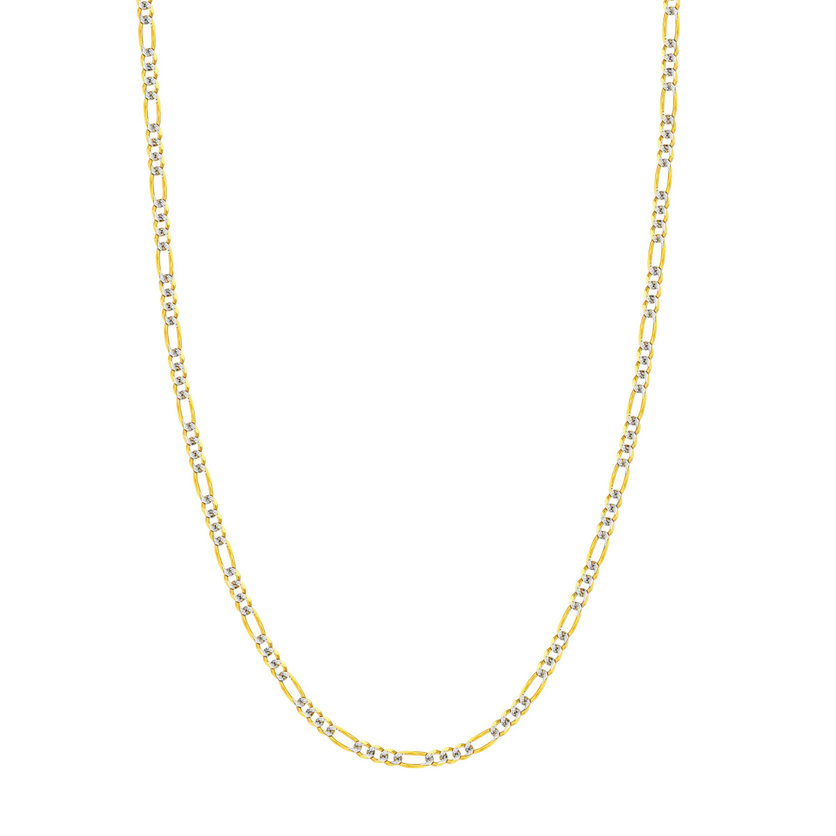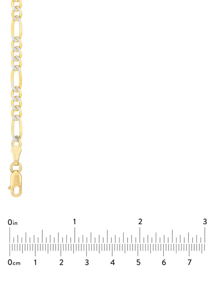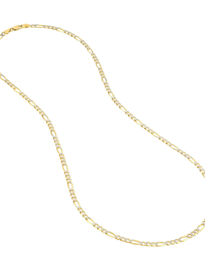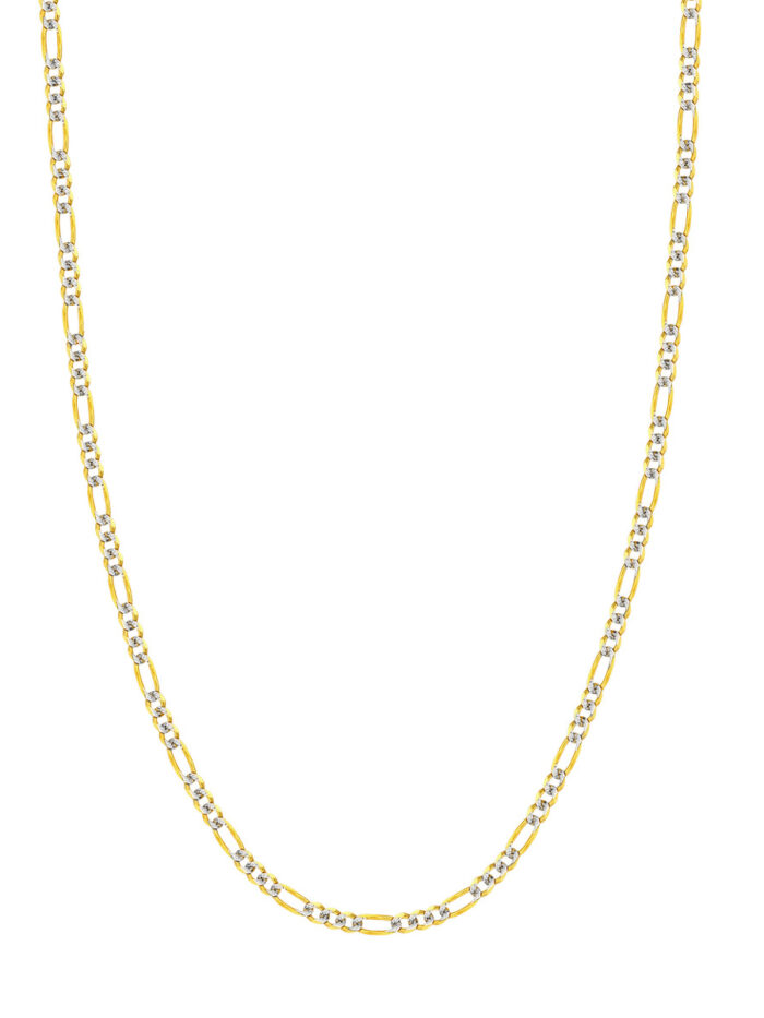 Elevate your style with this stunning Two-Tone Pave Figaro Chain. Crafted in lustrous 14K yellow and white gold, this chain features the intricate diamond-cutting of the Pave Figaro design, reflecting light with every movement. The secure lobster clasp closure ensures easy wear, while the 3.9mm width adds a touch of elegance. Measuring 18 inches in length, this chain is the perfect finishing touch to any outfit.