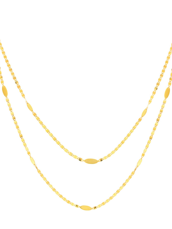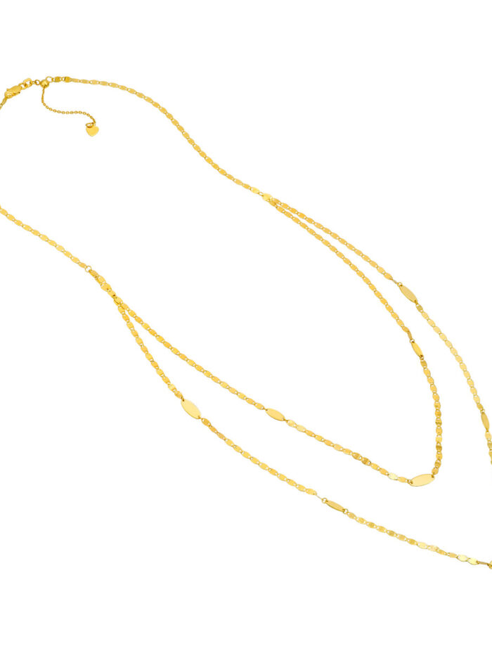 Effortlessly elevate your style with this stunning Valentino and Marquise Layered Duet Necklace. Crafted in 14K yellow gold, this necklace features a pre-layered design, combining a delicate Valentino chain with captivating marquise-shaped dangles. The layered look adds a touch of modern sophistication, making it perfect for both casual and dressy occasions. The adjustable chain allows for a customized fit, ensuring a comfortable and flattering look.