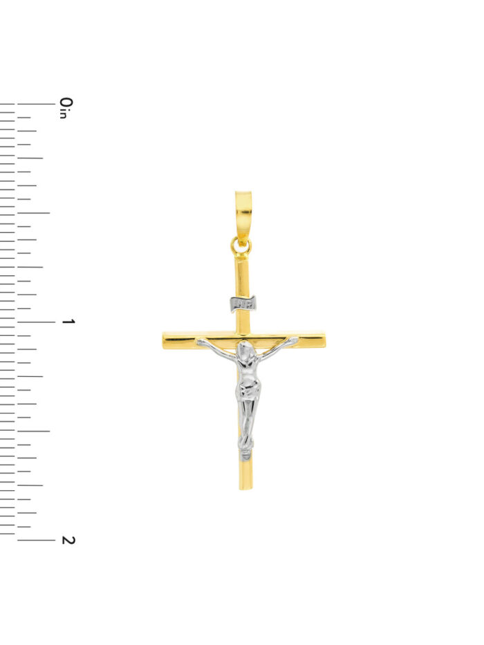 This elegant vertical flat tube cross pendant is crafted in a striking two-tone finish of 14K white and yellow gold. The design is both simple and sophisticated, making it a versatile piece that can be worn every day. A perfect gift for religious holidays or special occasions, this pendant is sure to be appreciated. The high-quality materials and craftsmanship ensure that it will be treasured for years to come.