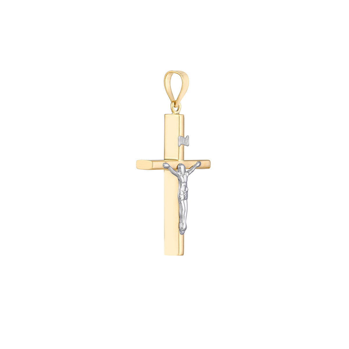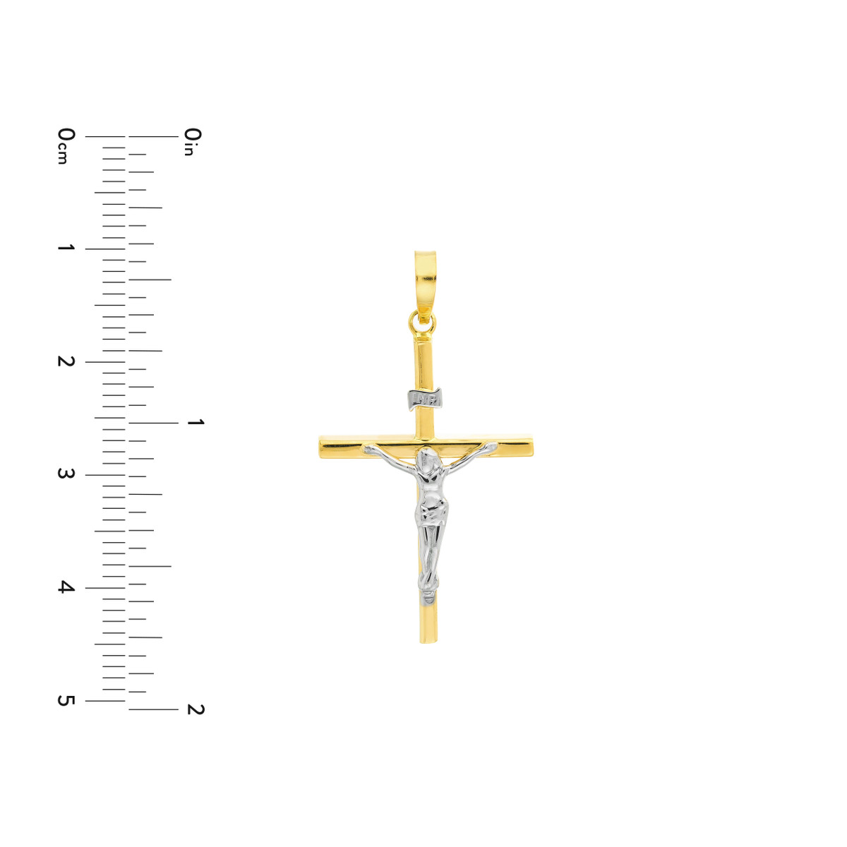 This elegant vertical flat tube cross pendant is crafted in a striking two-tone finish of 14K white and yellow gold. The design is both simple and sophisticated, making it a versatile piece that can be worn every day. A perfect gift for religious holidays or special occasions, this pendant is sure to be appreciated. The high-quality materials and craftsmanship ensure that it will be treasured for years to come.