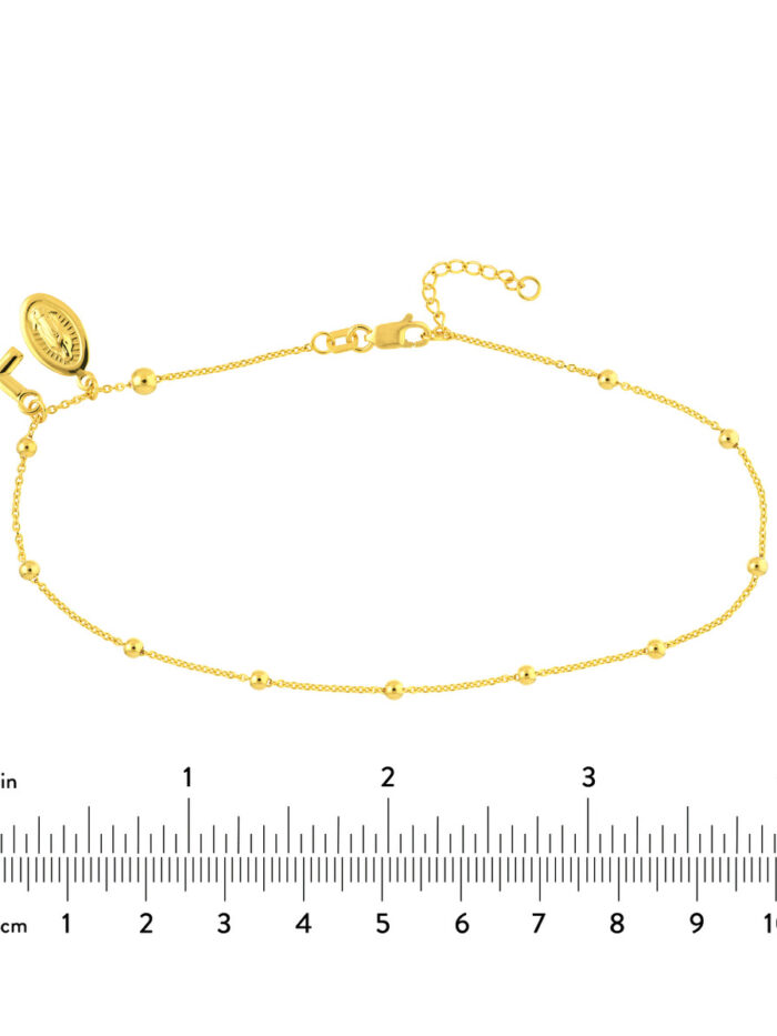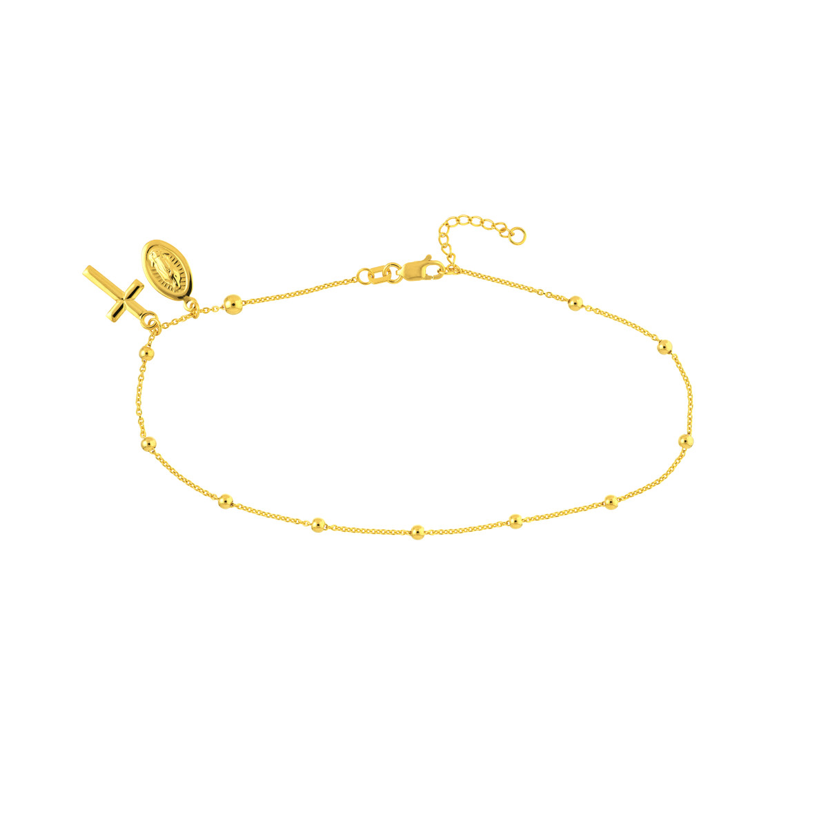 Express your faith and style with this elegant 14K yellow gold anklet. Featuring a delicate Virgin Mary and Cross design surrounded by shimmering bead elements, this piece adds a touch of spirituality and charm to any look. The adjustable chain allows for a comfortable fit, ranging from 9 to 10 inches.