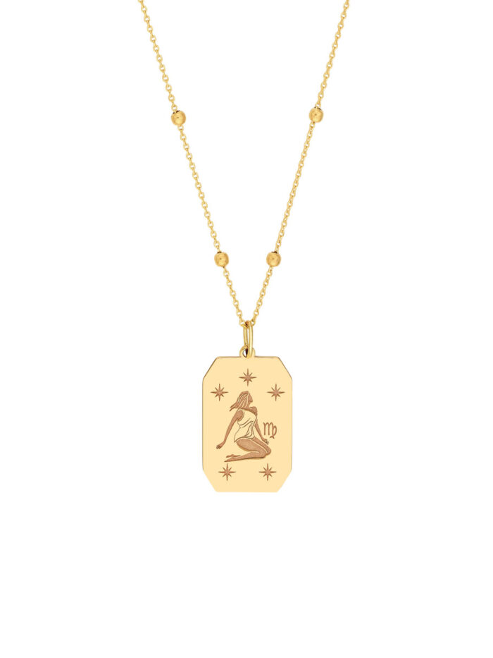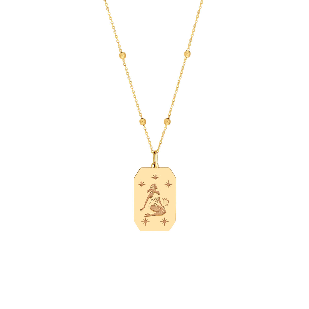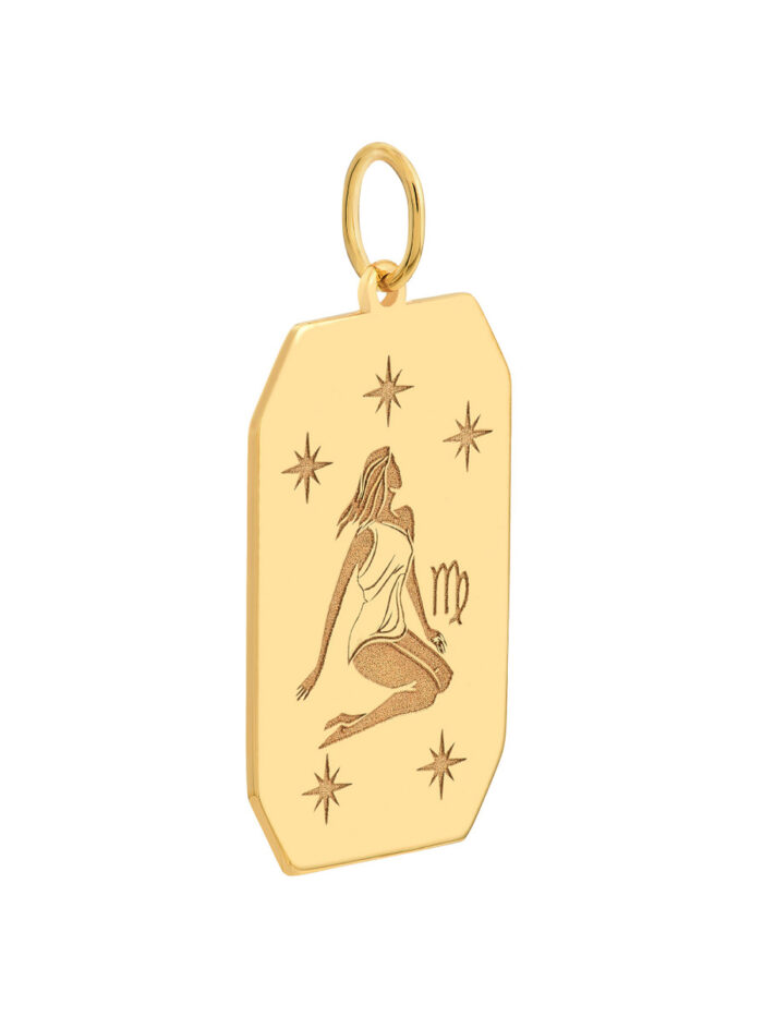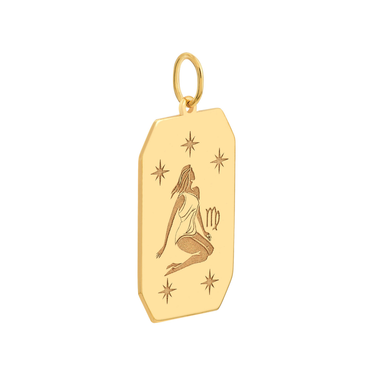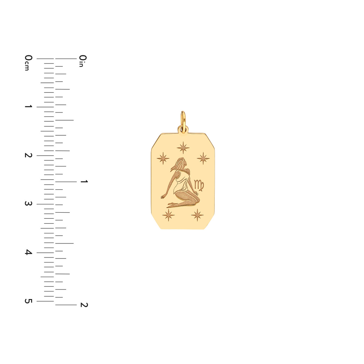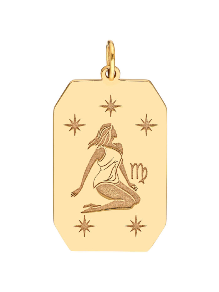 Showcase your grounded and thoughtful nature with this delicate Virgo pendant, crafted from 14K yellow gold. The 13x20mm pendant features an intricate engraved design, symbolizing the Virgo zodiac’s virtues of generosity, warmth, loyalty, and love. This pendant is a perfect reminder of your kind heart and unwavering strength. Pair it with your favorite chain for a touch of personalized elegance.