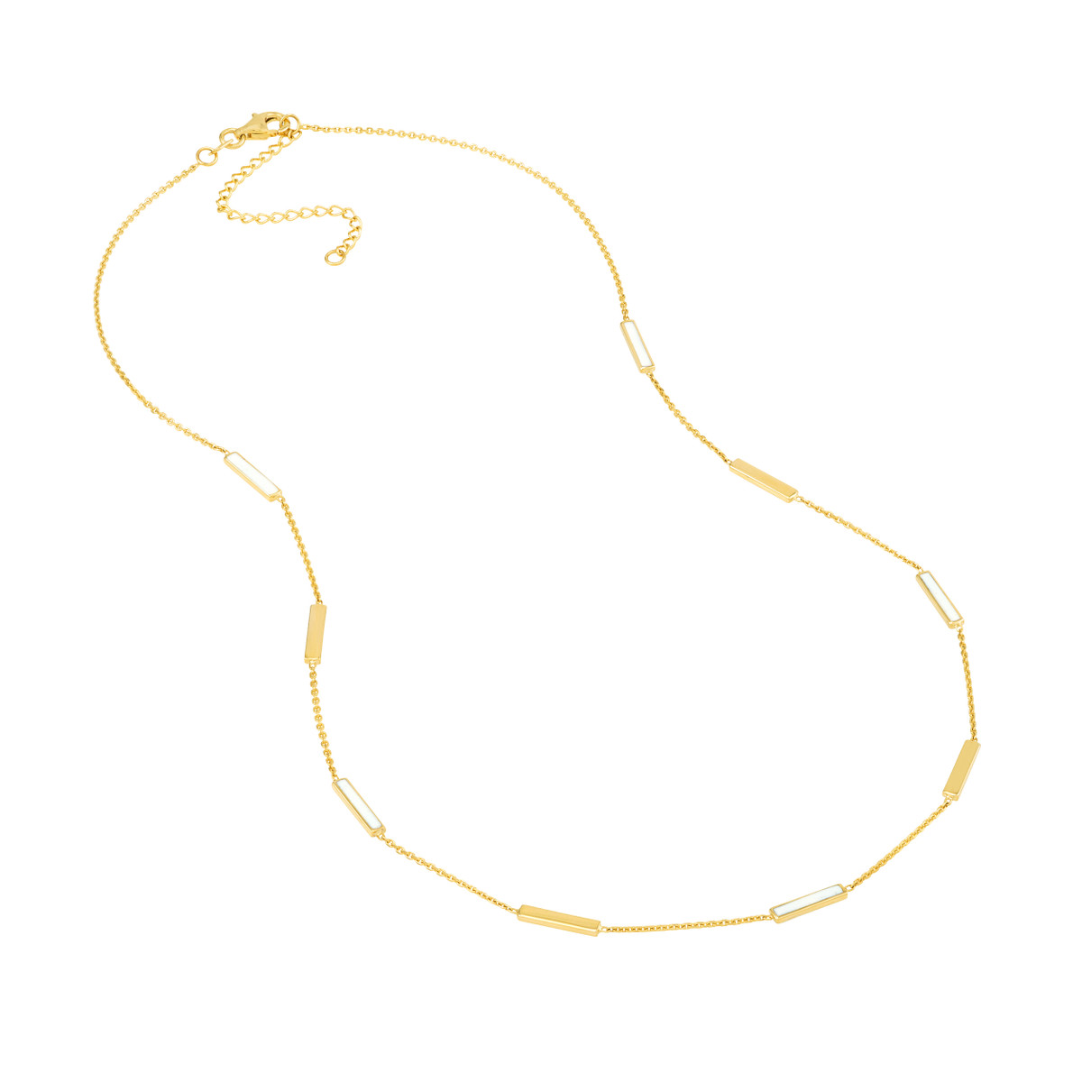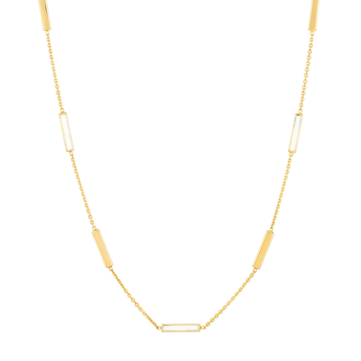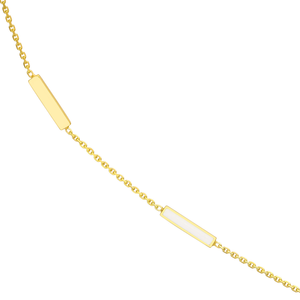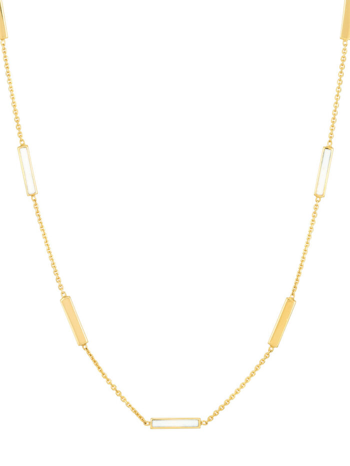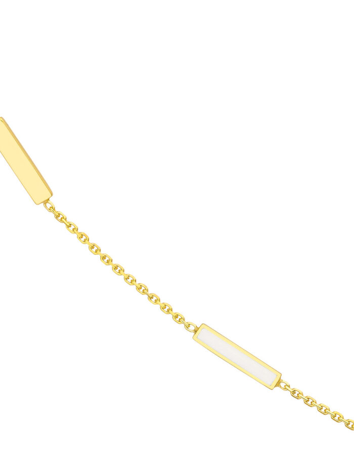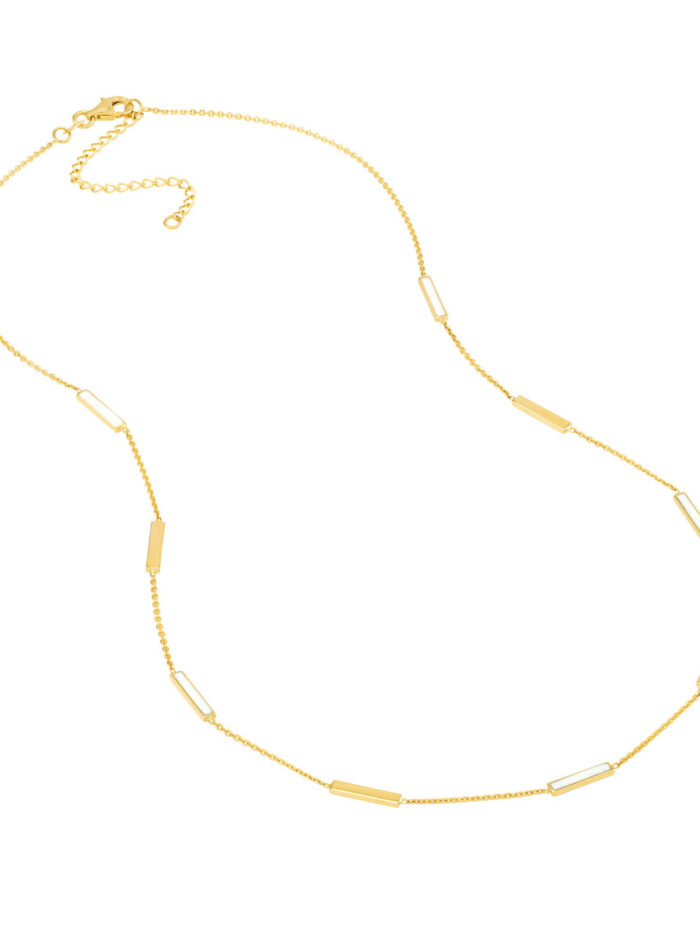 Add a touch of chic sophistication to your everyday style with this white enamel alternating bar necklace. Crafted from gleaming 14K yellow gold, the alternating bars are accented with delicate white enamel, creating a beautiful contrast. The adjustable box chain (16-18 inches) ensures a comfortable and personalized fit.