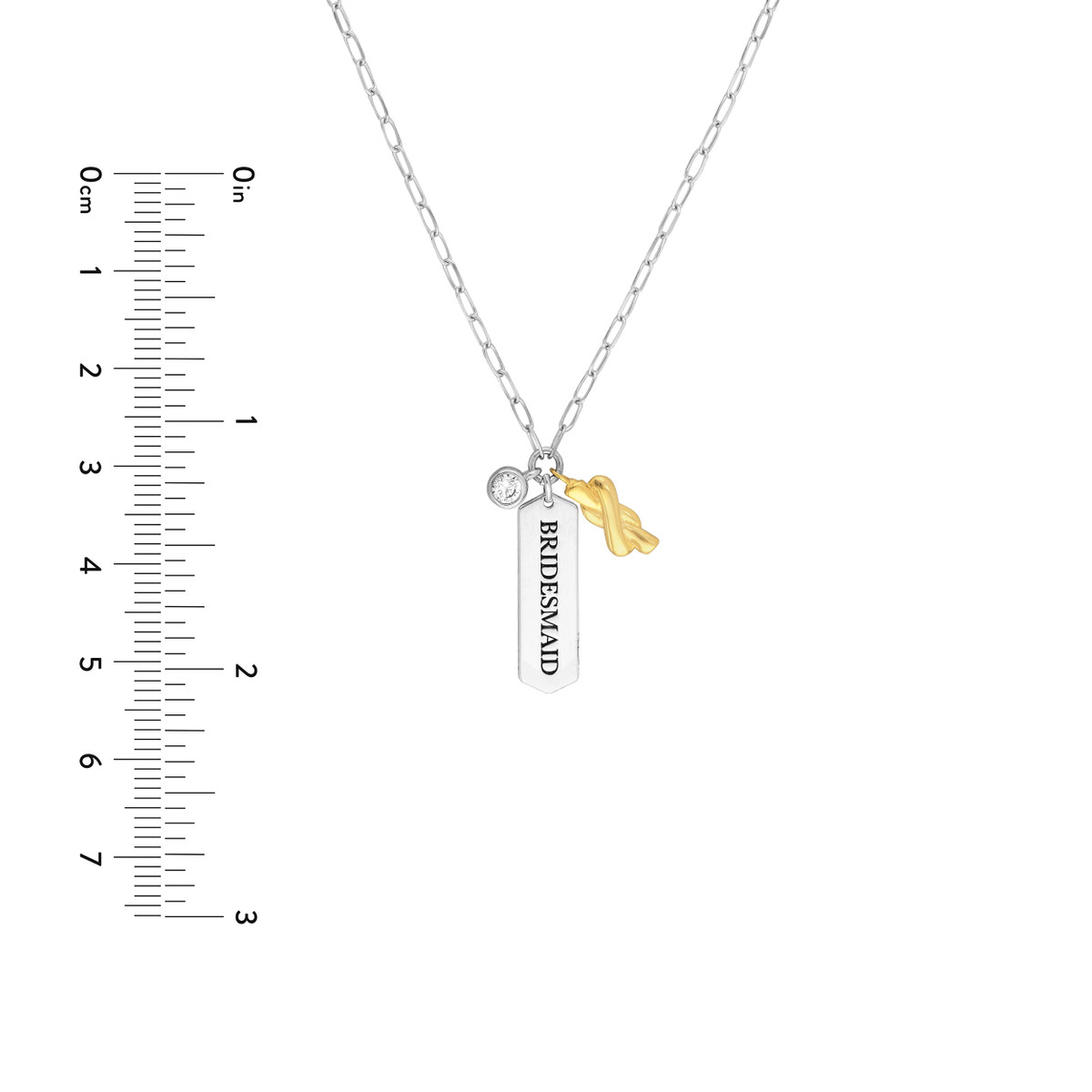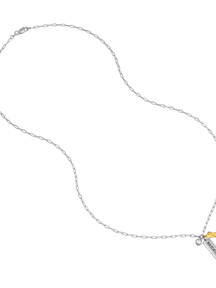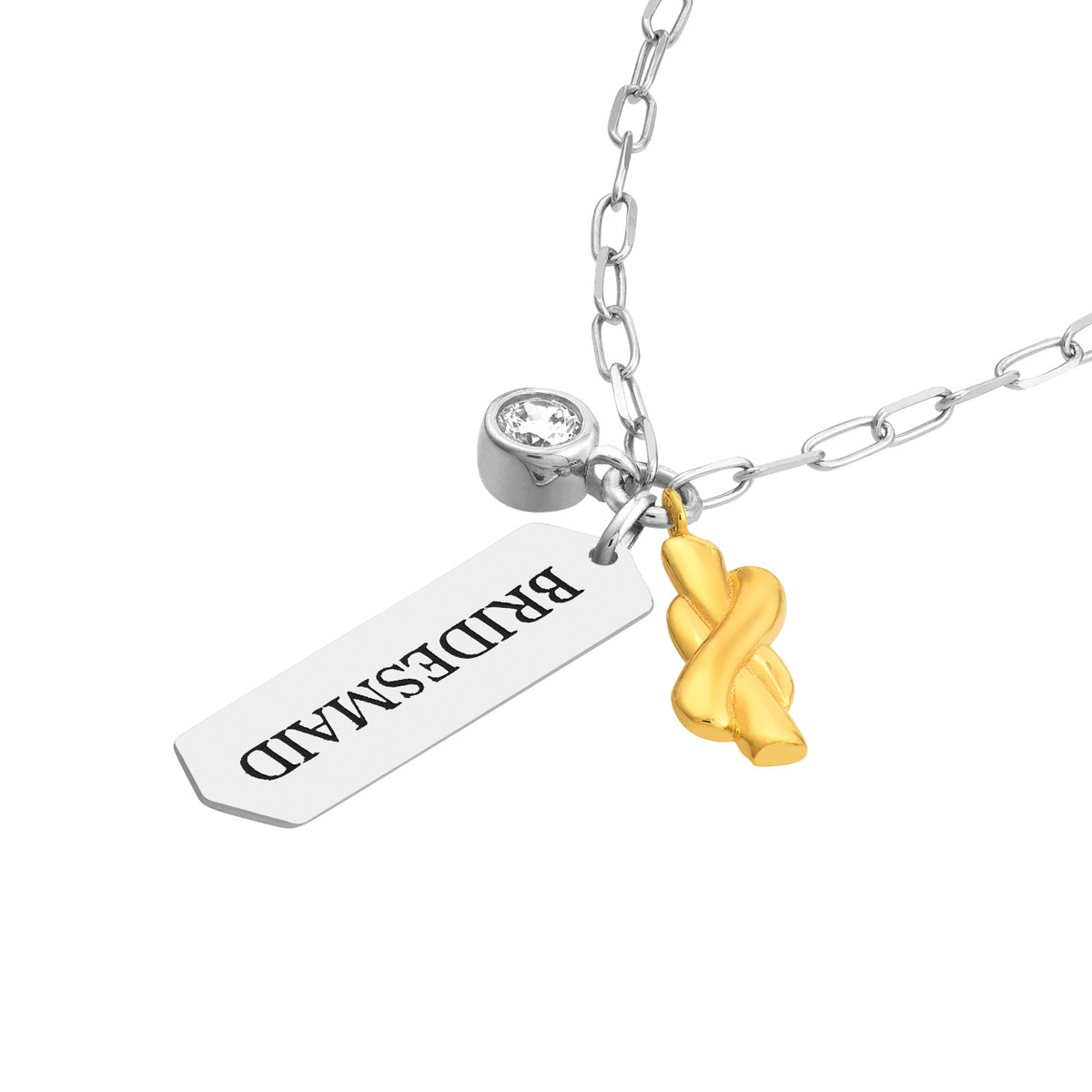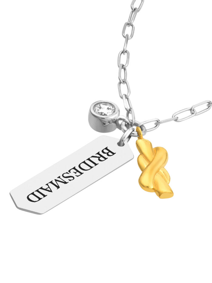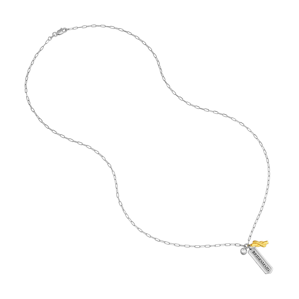 Celebrate the special bond with this elegant Bridesmaid necklace. Crafted from yellow gold-plated sterling silver, it features a delicate paper clip chain adorned with a charming ‘Bridesmaid’ engraved bar and sparkling CZ accents. The fixed 20-inch length adds a touch of sophistication to any bridal ensemble.