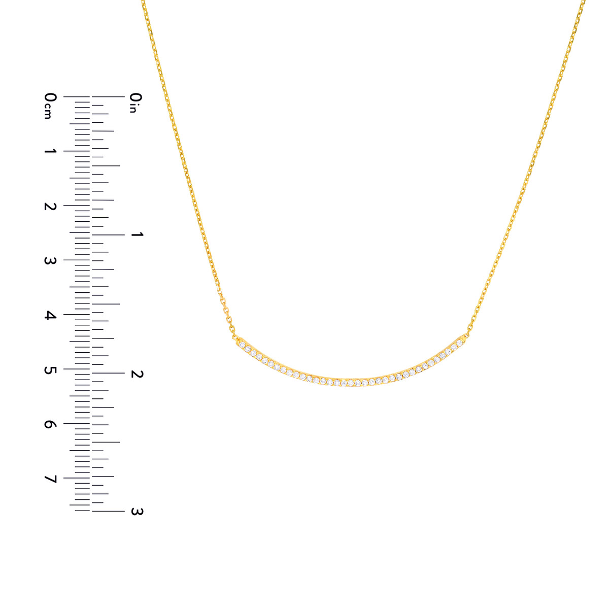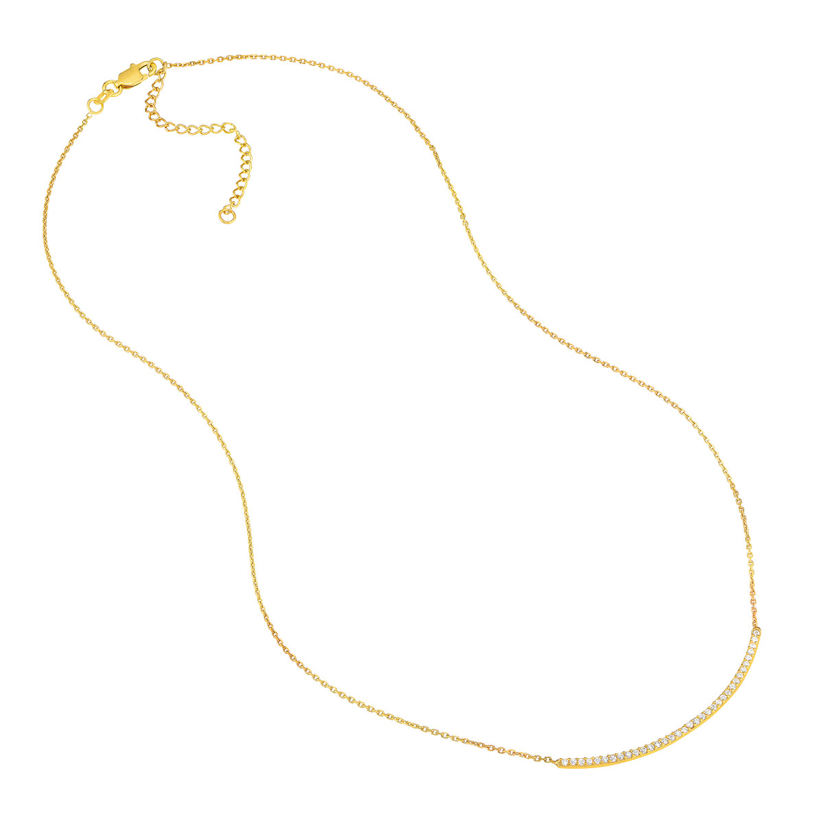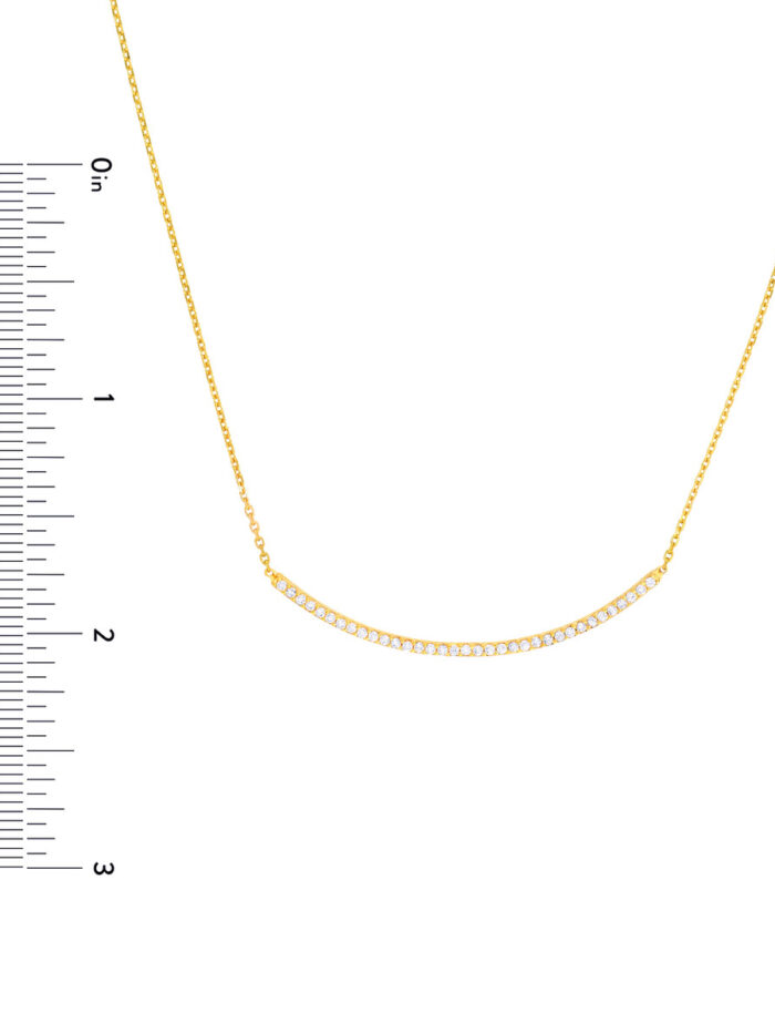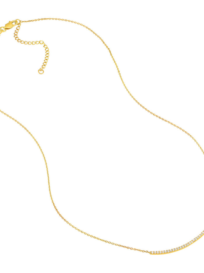 Shine bright with this beautiful yellow gold plated sterling silver curved bar necklace. The dazzling CZ stones add a touch of glamour, while the classic curved bar design is both timeless and stylish. The adjustable length allows for a personalized fit, making it perfect for layering or wearing on its own.